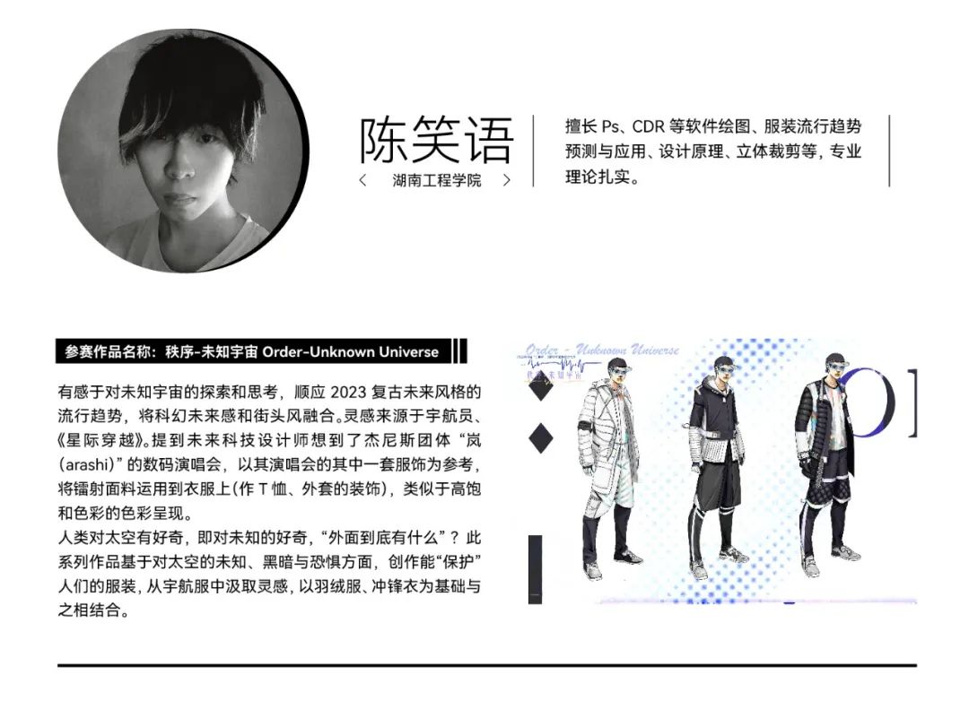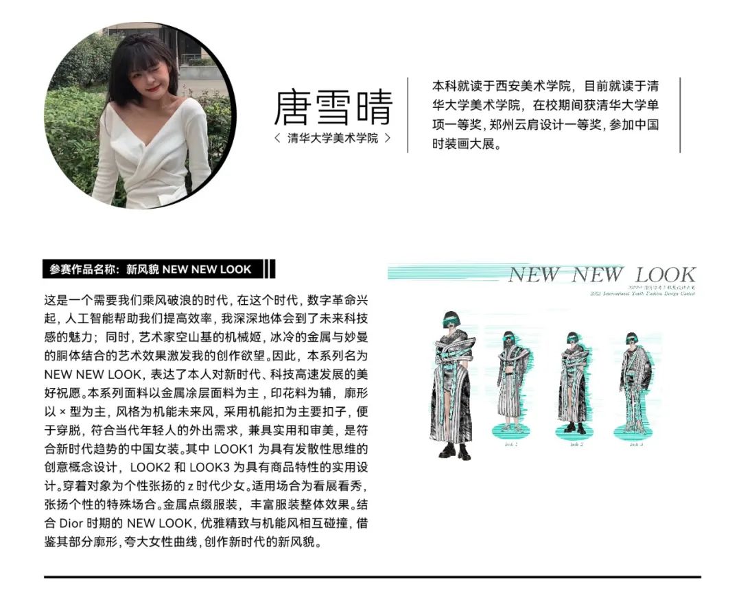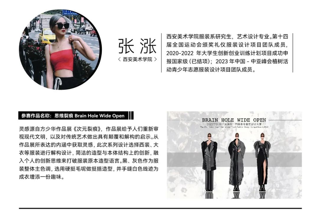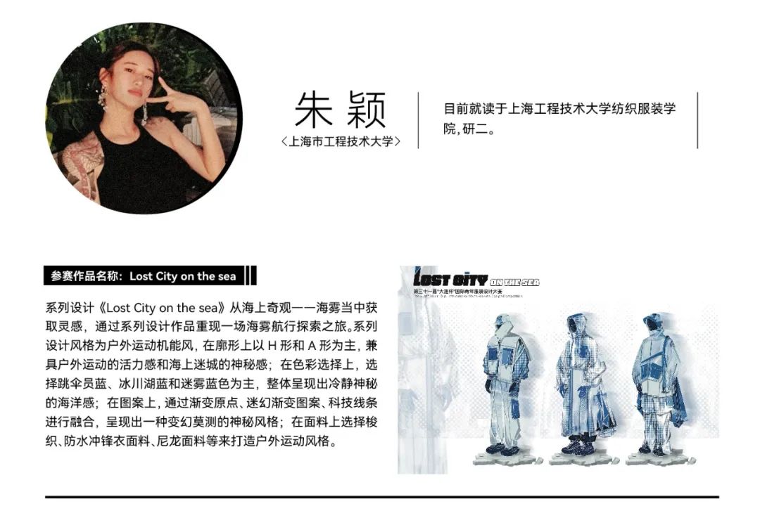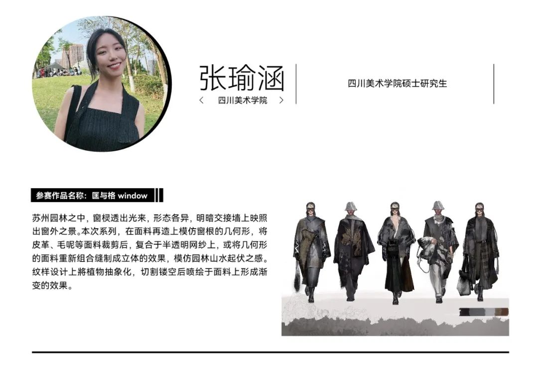 经过初选,在最终入围决赛的院校组参赛作品中,我们看到了青年设计师丰富的创作活力和实验精神。参赛作品题材新颖,极具创意,从街头潮流、传统文化到环保可持续等多个领域,都显示出当代青年设计力量对时尚的革新探索精神。