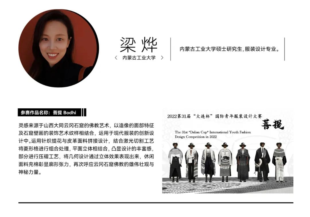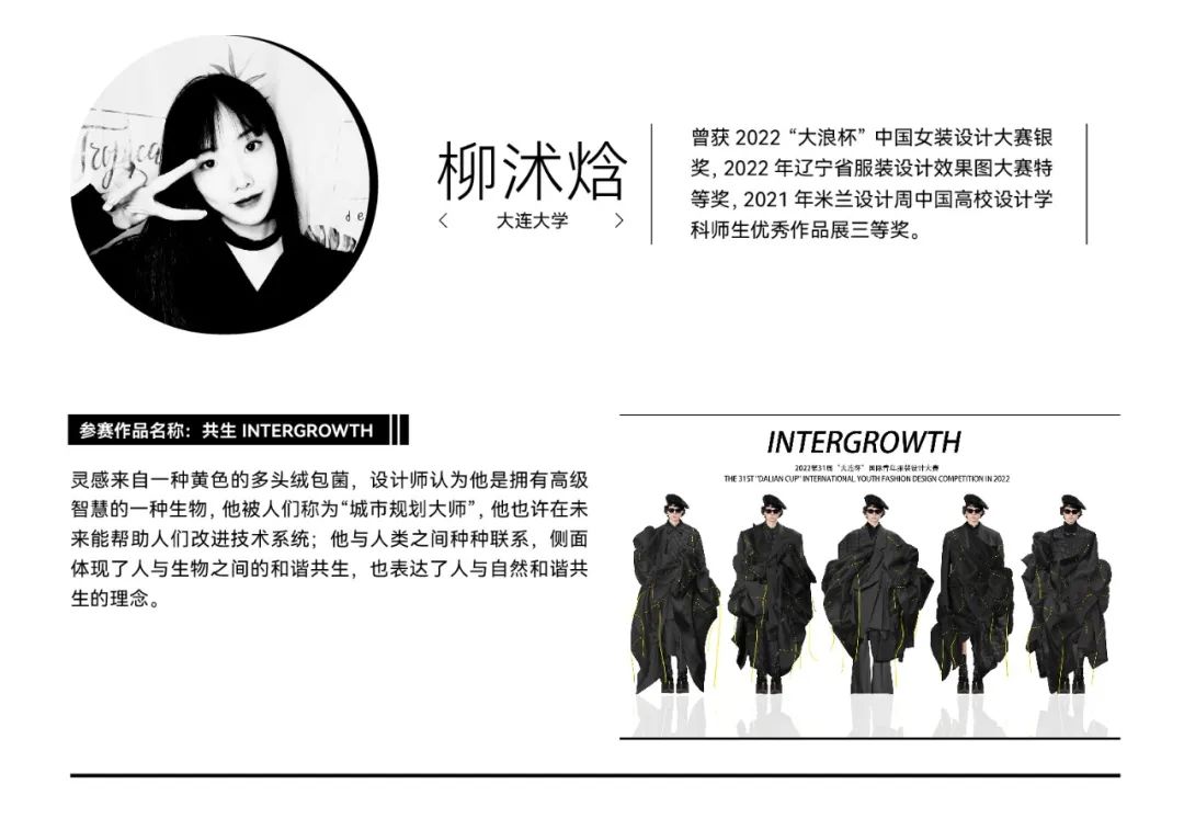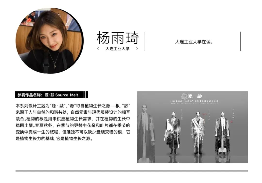 第31届“大连杯”国际青年服装设计大赛由中国服装设计师协会和大连市人民政府共同主办,共收到来自海内外青年设计师的1500余份作品。除职业组之外,为更好培养青年设计师的创新能力和时尚潮流意识,本届“大连杯”国际青年服装设计大赛特别设立了院校组,向各大院校的新生力量发出邀请,为思潮前卫的“时尚新势力”提供展示才华的舞台。