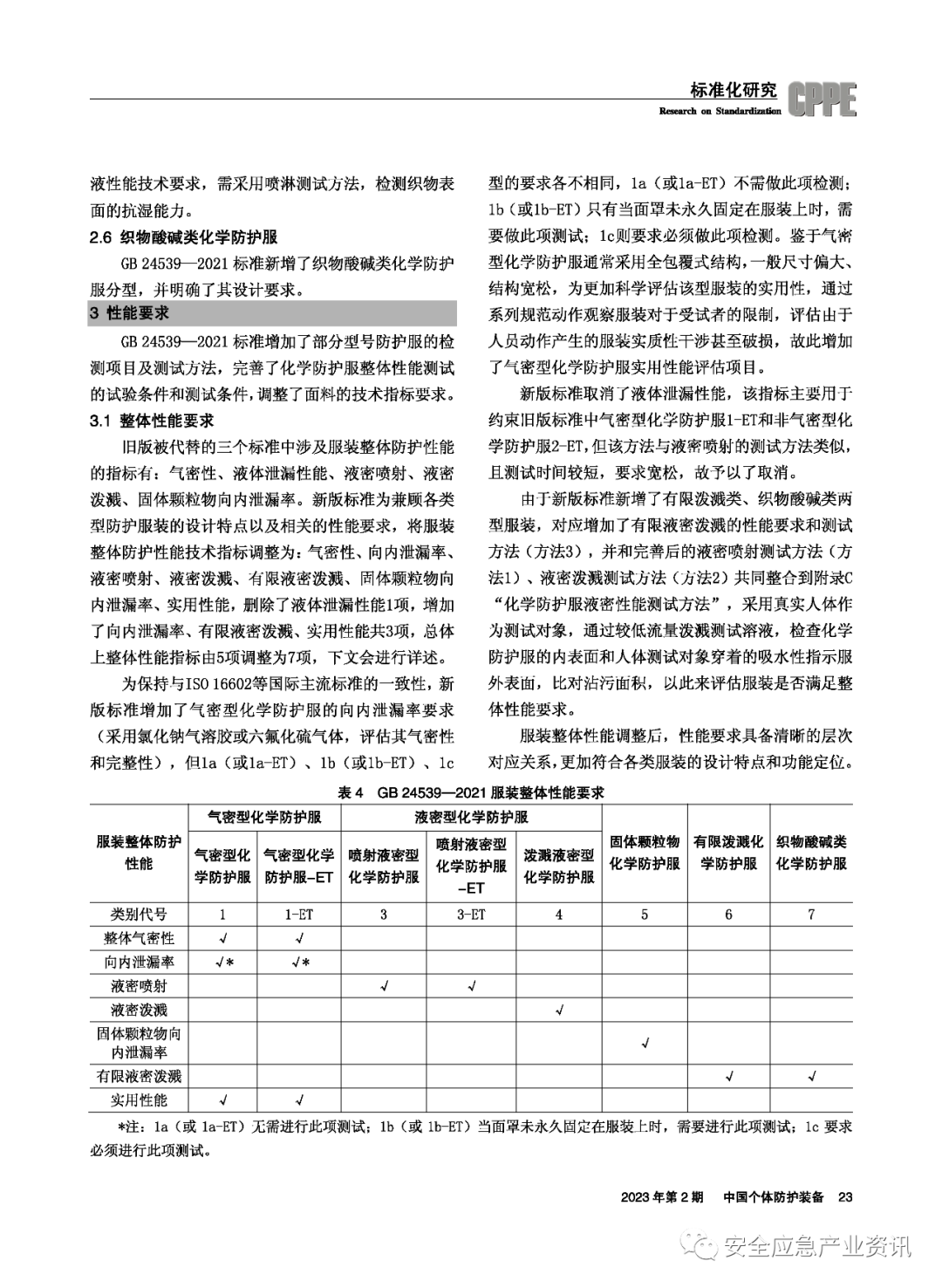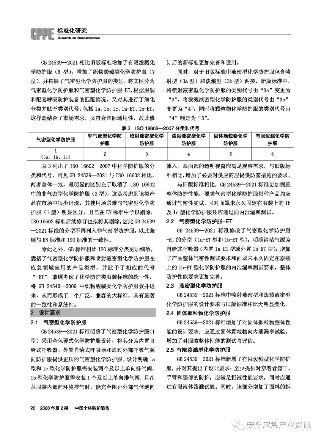 表3列出了ISO 16602—2007中化学防护服的分类和代号,可见GB 24539—2021与ISO 16602相比,两者总体一致,最明显的区别在于取消了ISO 16602中的非气密型化学防护服(2型),这是考虑到该类产品在市场中很少出现,其使用场景难与气密型化学防护服(1型)明显区分,且已在EN标准中予以剔除,ISO 16602标准后续修订也拟将其剔除,因此GB 24539—2021标准的分型不再列入非气密型防护服,以此兼顾与EN标准和ISO标准的一致性。