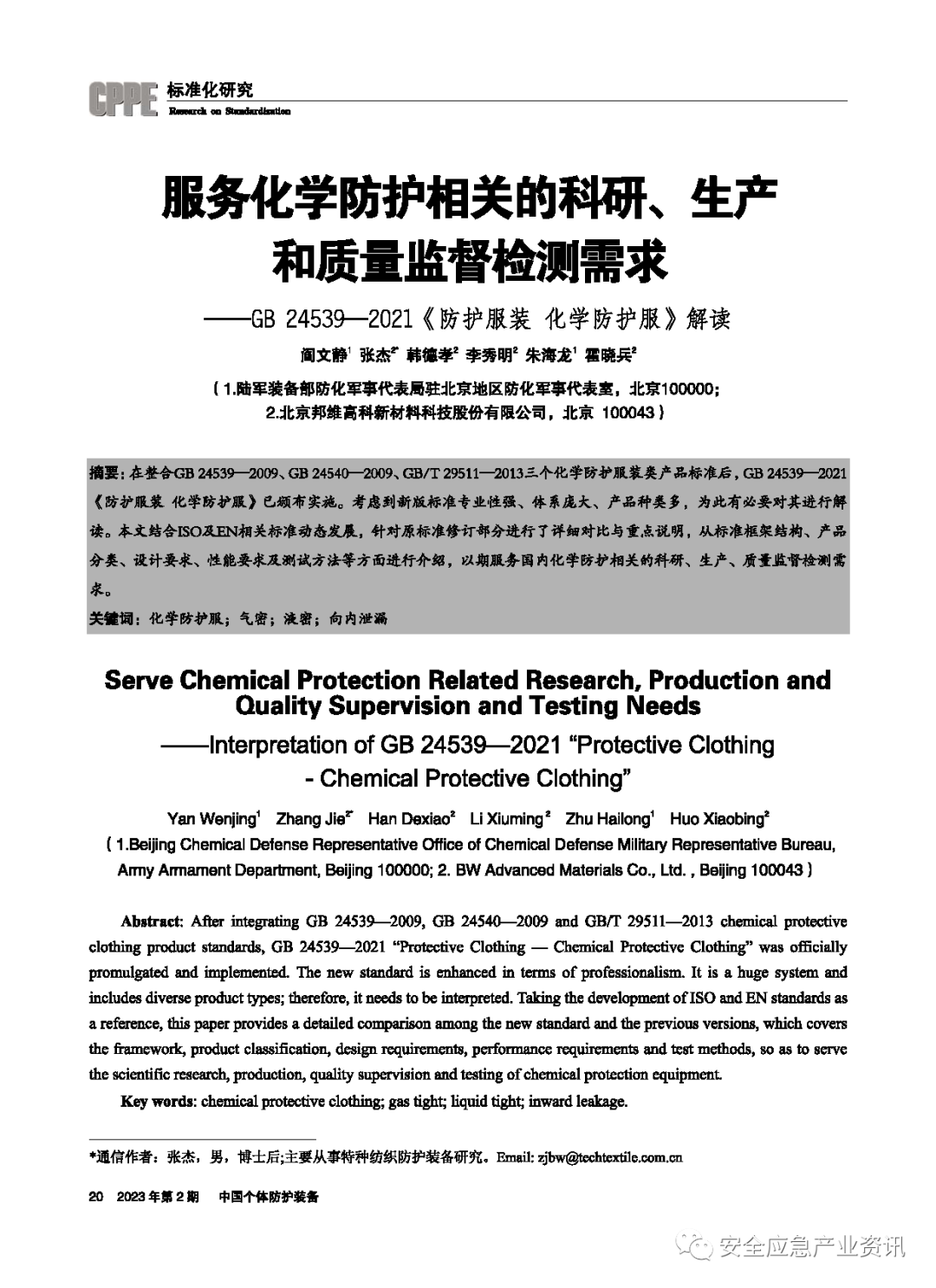 摘要:在整合GB 24539—2009《防护服装 化学防护服通用技术要求》、GB 24540—2009《防护服装 酸碱类化学品防护服》、GB/T 29511—2013《防护服装 固体颗粒物化学防护服》三个化学防护服装类产品标准后,GB 24539—2021《防护服装 化学防护服》已颁布实施。考虑到新版标准专业性强、体系庞大、产品种类多,为此有必要对其进行解读。本文结合ISO及EN相关标准动态发展,针对原标准修订部分进行了详细对比与重点说明,从标准框架结构、产品分类、设计要求、性能要求及测试方法等方面进行介绍,以期服务国内化学防护相关的科研、生产、质量监督检测需求。