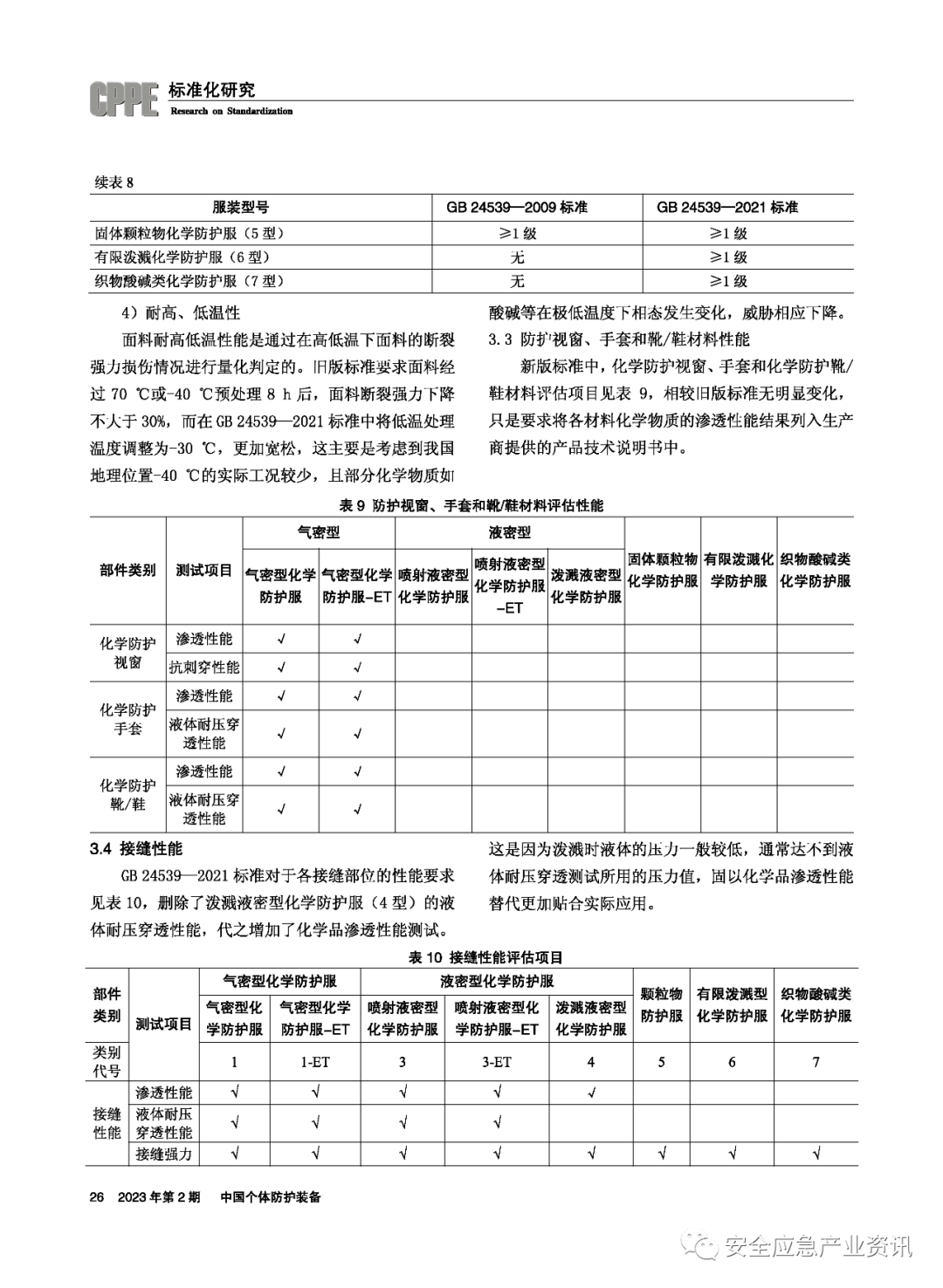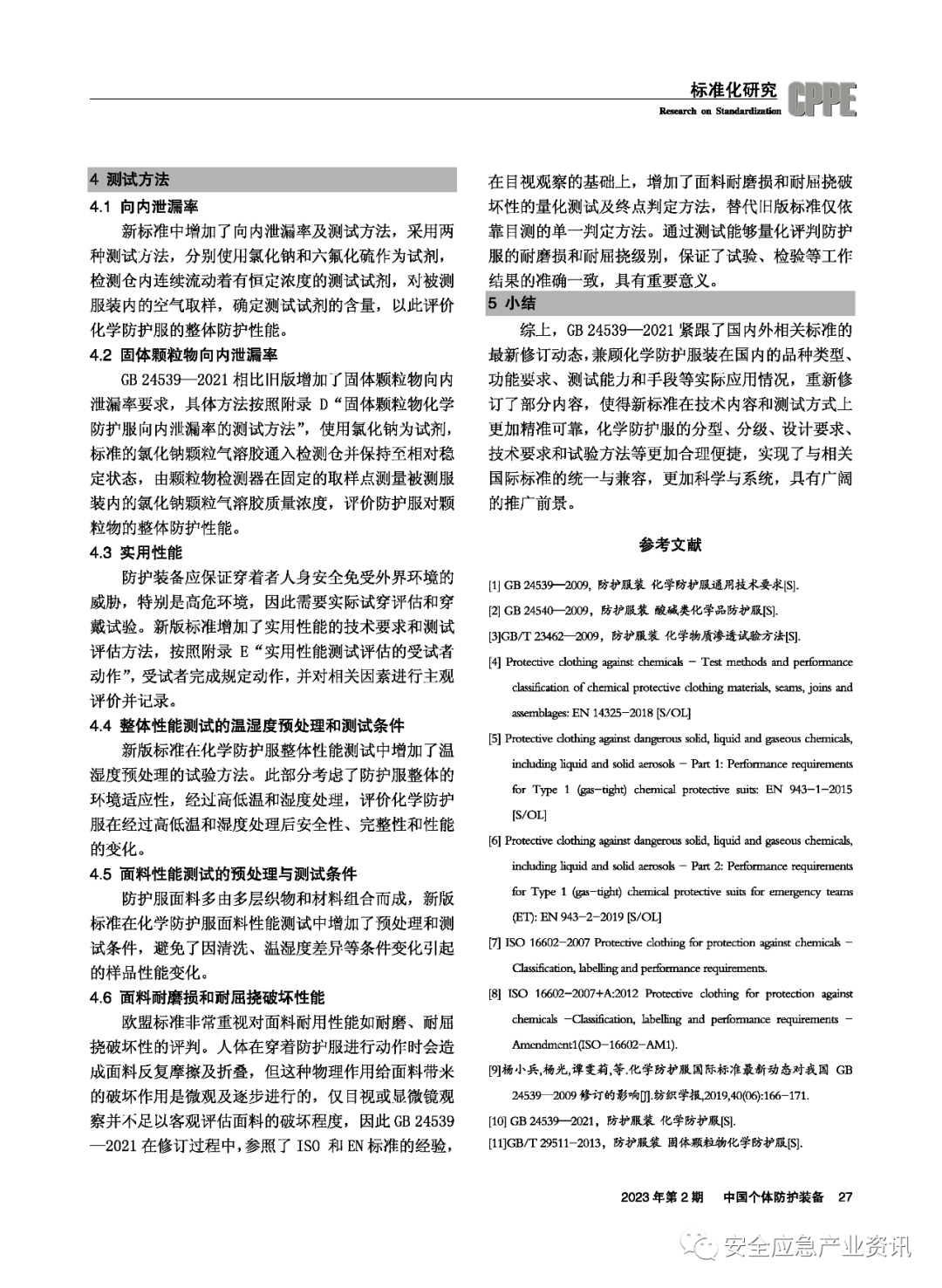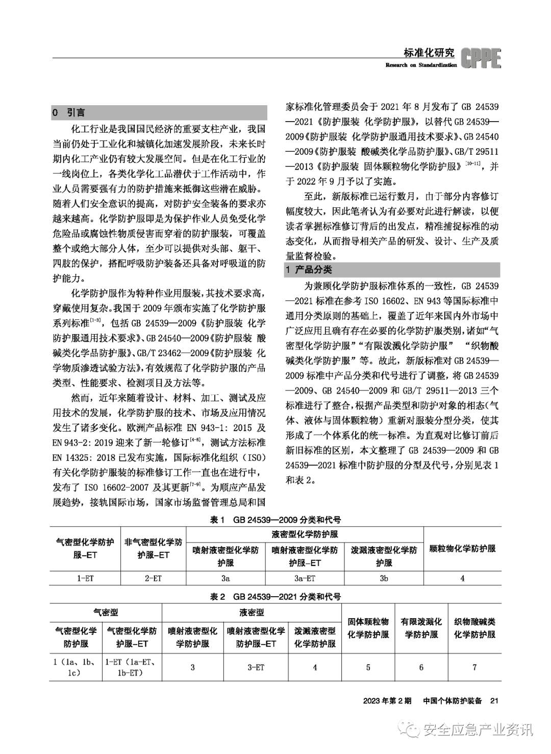为顺应产品发展趋势,接轨国际市场,国家市场监督管理总局和国家标准化管理委员会于2021年8月发布了GB 24539—2021《防护服装 化学防护服》,以替代GB 24539—2009《防护服装 化学防护服通用技术要求》、GB 24540—2009《防护服装 酸碱类化学品防护服》、GB/T 29511—2013《防护服装 固体颗粒物化学防护服》[10-11],并于2022年9月予以了实施。