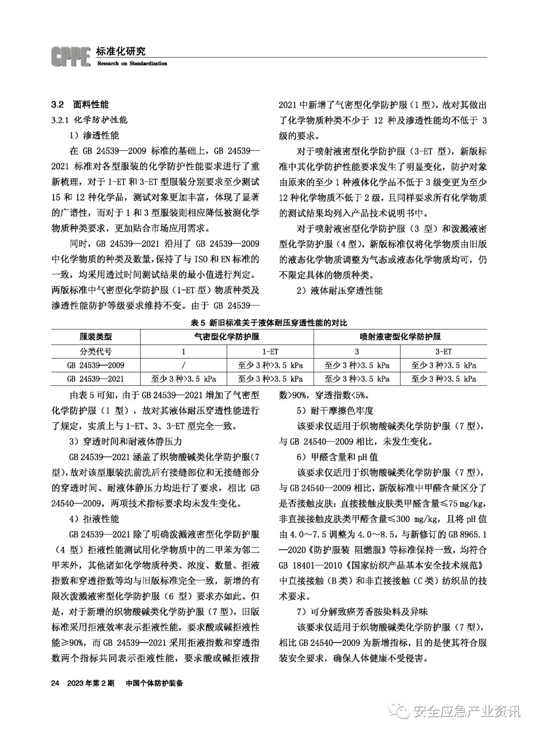 综上,GB 24539—2021紧跟了国内外相关标准的最新修订动态,兼顾化学防护服装在国内的品种类型、功能要求、测试能力和手段等实际应用情况,重新修订了部分内容,使得新标准在技术内容和测试方式上更加精准可靠,化学防护服的分型、分级、设计要求、技术要求和试验方法等更加合理便捷,实现了与相关国际标准的统一与兼容,更加科学与系统,具有广阔的推广前景。
