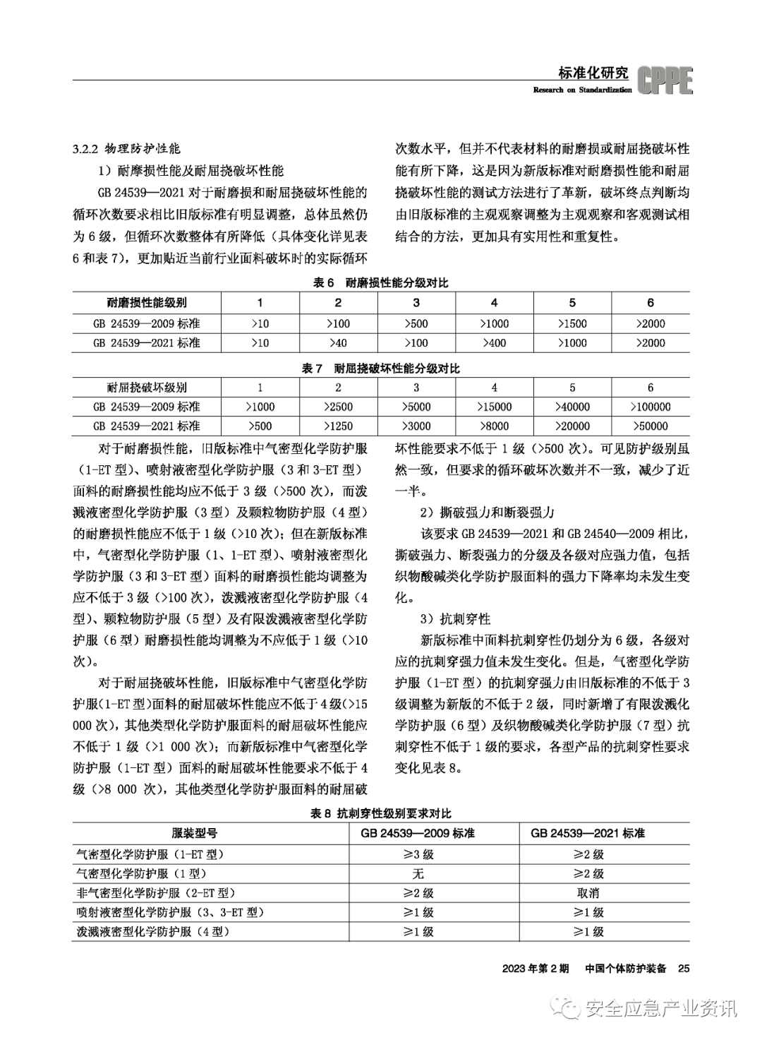 对于耐磨损性能,旧版标准中气密型化学防护服(1-ET型)、喷射液密型化学防护服(3和3-ET型)面料的耐磨损性能均应不低于3级(>500次),而泼溅液密型化学防护服(3型)及颗粒物防护服(4型)的耐磨损性能应不低于1级(>10次);但在新版标准中,气密型化学防护服(1、1-ET型)、喷射液密型化学防护服(3和3-ET型)面料的耐磨损性能均调整为应不低于3级(>100次),泼溅液密型化学防护服(4型)、颗粒物防护服(5型)及有限泼溅液密型化学防护服(6型)耐磨损性能均调整为不应低于1级(>10次)。