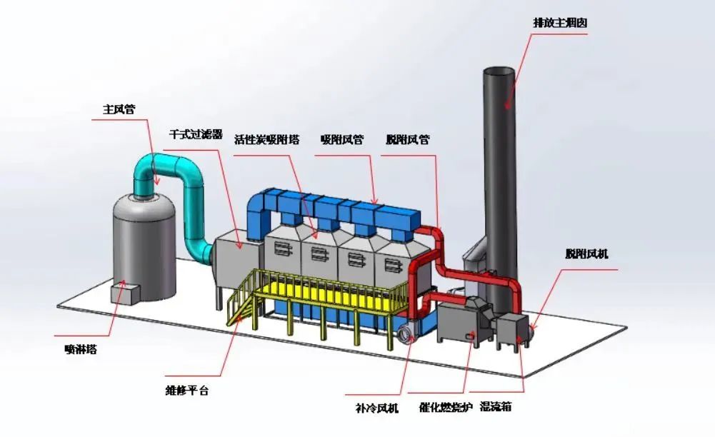 吸附法可以将废气中的有机成分与吸附剂进行物理结合或化学反应,达到去污的目的。适宜于中低浓度且回收利用价值高的有机废气VOCs的处理,可应用于净化涂料、油漆、塑料、橡胶等化工生产排放出的含溶剂或有机物的废气。