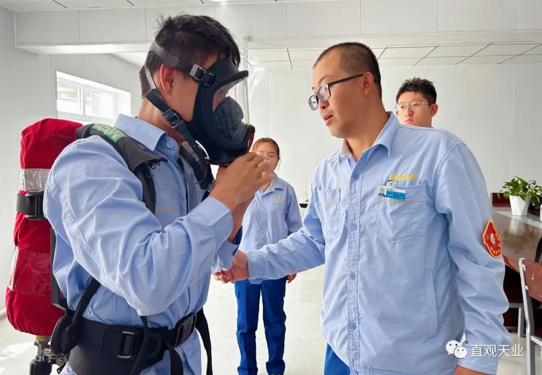 8月17日,在新疆天业天能化工有限公司化工厂聚合车间操作室内,该车间安全员赵建刚正在给新员工讲解正压式空气呼吸器佩戴使用方法和注意事项。这是天能化工厂开展“现场教学”的一处场景。