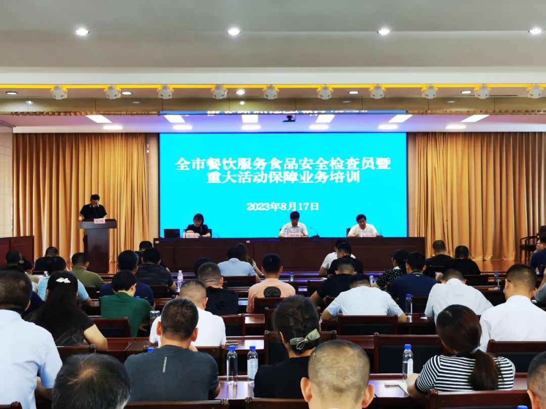近日,全市餐饮服务食品安全检查员暨重大活动保障业务培训会议在烟台市市场监督管理局召开。会议现场,由烟台业达国际会展有限公司代表全市15家承接保障2023绿色低碳发展大会餐饮保障的单位,宣读本次大会的重大活动保障食品安全承诺书,并组织保障酒店现场签订承诺书;市市场监督管理局餐饮科石广胜科长,解读《重大活动餐饮服务食品安全风险管控及保障流程》,并对相关工作进行部署和安排;最后组织一线监管人员和酒店负责人及食品安全总监、食品安全员进行餐饮服务食品安全相关知识现场考核。
