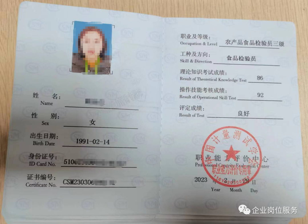 食品检验员证书样本