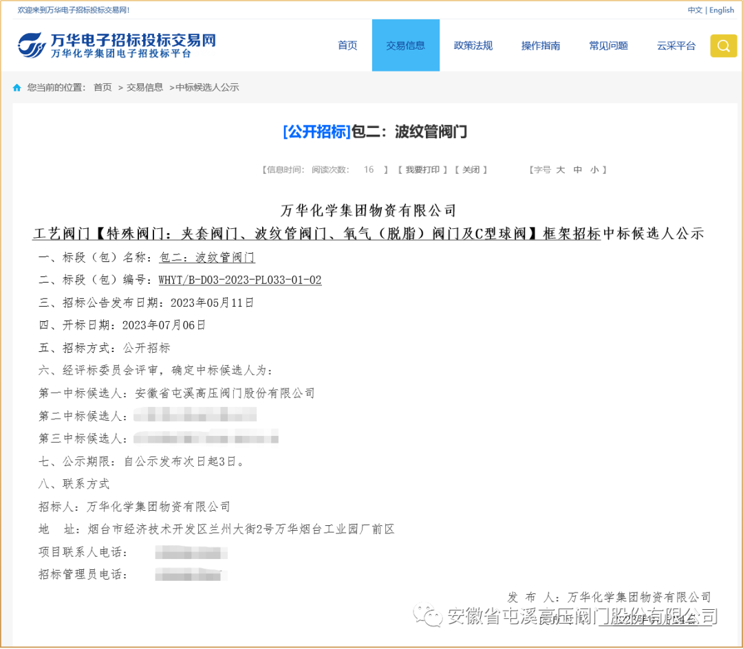 近日,安徽省屯溪高压阀门股份有限公司的拳头产品、行业第一的波纹管阀门在万华化学集团物资有限公司公开招标中以第一的成绩确定为中标候选人!