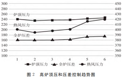 高炉炉顶压力的提高,主要受炉顶设备能力的限制。X高炉顶压虽然接近设计顶压,但还有一定的提升空间。随着加风过程,将炉顶压力由240kPa提高到设计顶压245kPa,热风压力由400kPa提高到420kPa,全炉压差由160kPa提高到175kPa。