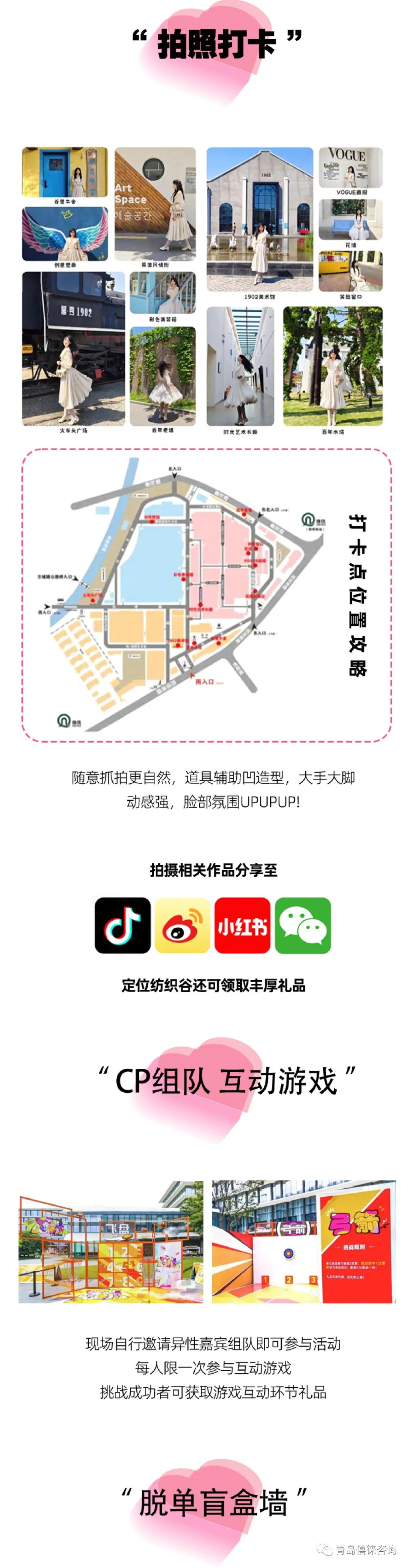 周日晚上5点纺织谷集合,自行报名,愿意一起搭伴去纺织谷的入活动小群哈,听说有单身市集活动,说不定七夕前可以脱单呢,当然除此之外也是一个闲逛的好地方,有文创店,文艺咖啡店,然后一起逛个夜市,认识一下新朋友哈。