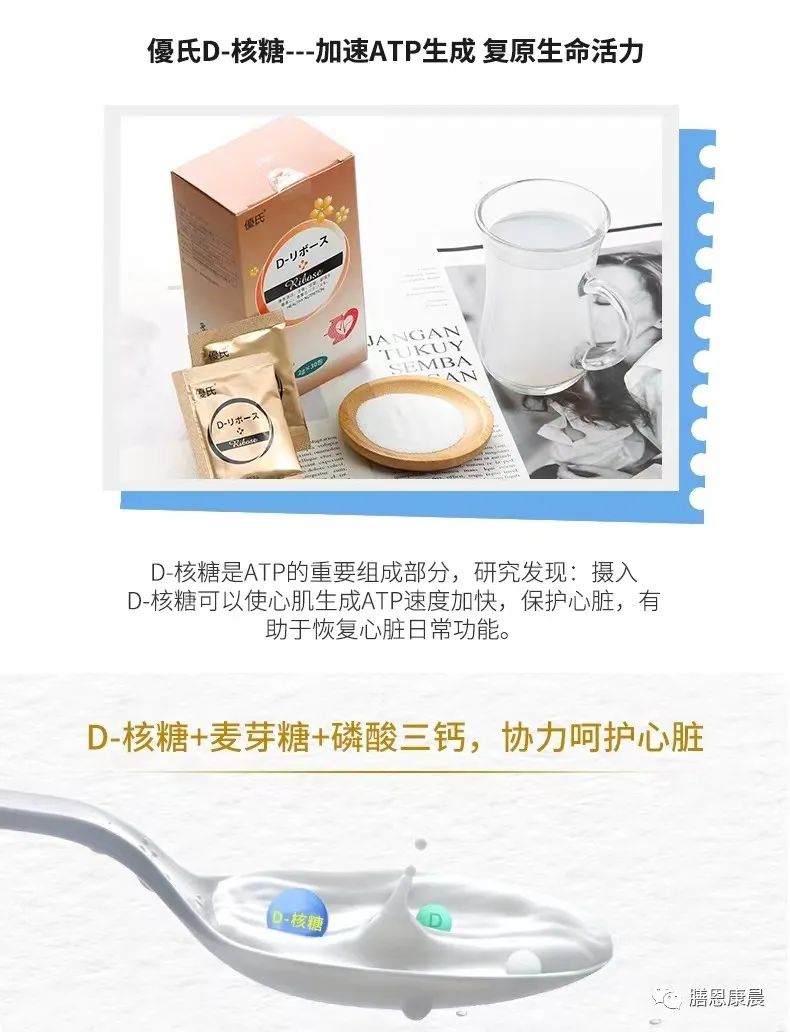 心力衰竭群体的希望 心力衰竭意味着心肌无法泵出足够的血液来满足身体的新陈谢需求。在心力衰竭中,心肌细胞中的 D-核糖产量下降。 3,7 这会导致ATP生成减少 ,从而导致最需要能量的器官的肌肉细胞出现细胞能量不足。 7 口服D-核糖可以帮助产生新的 ATP 分子并恢复 心脏能量水平。 7,8 临床试验表明,口服D-核糖可以改善 心力衰竭患者的心功能。 实际上D核糖真的很不错呀!不单单对冠心病、心衰有明显的效果,对糖尿病患者也有降糖作用。实际上我骨关节酸痛,上楼没有劲,我吃了一个星期以后,最起码肌肉不酸痛了。