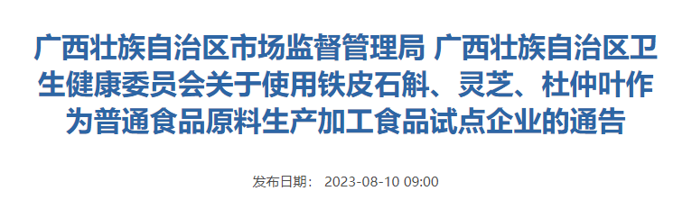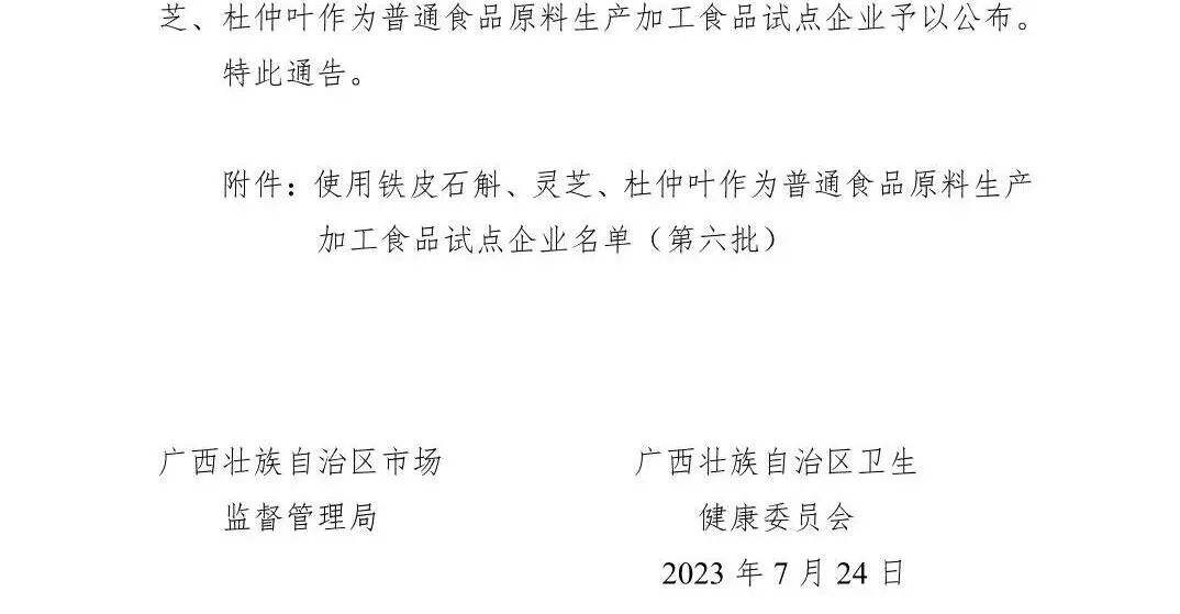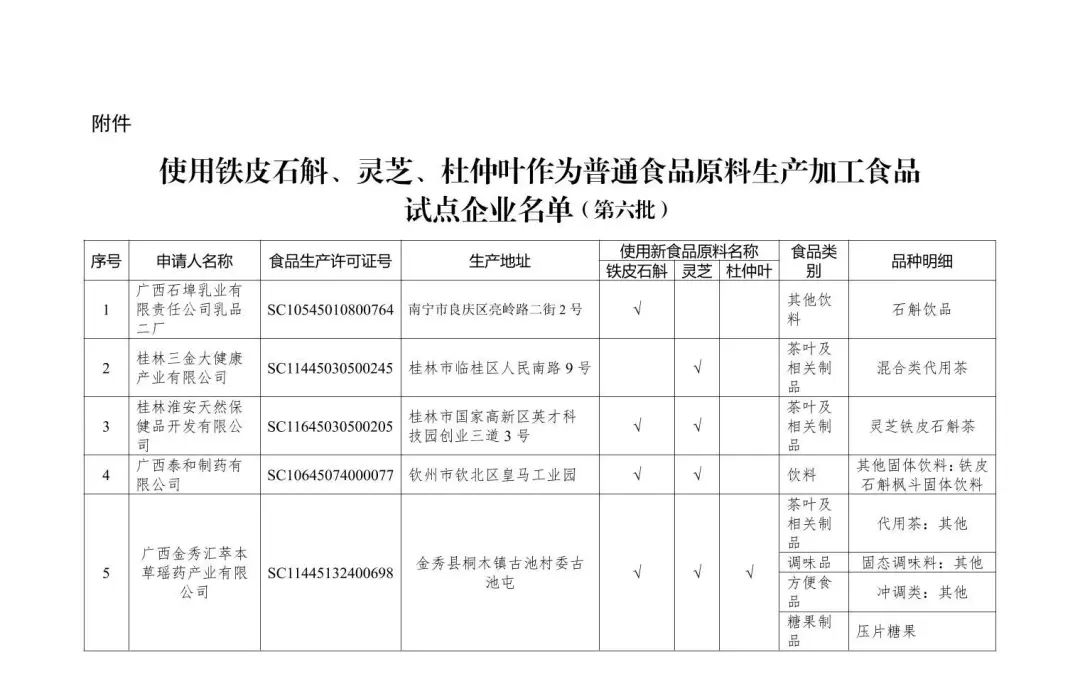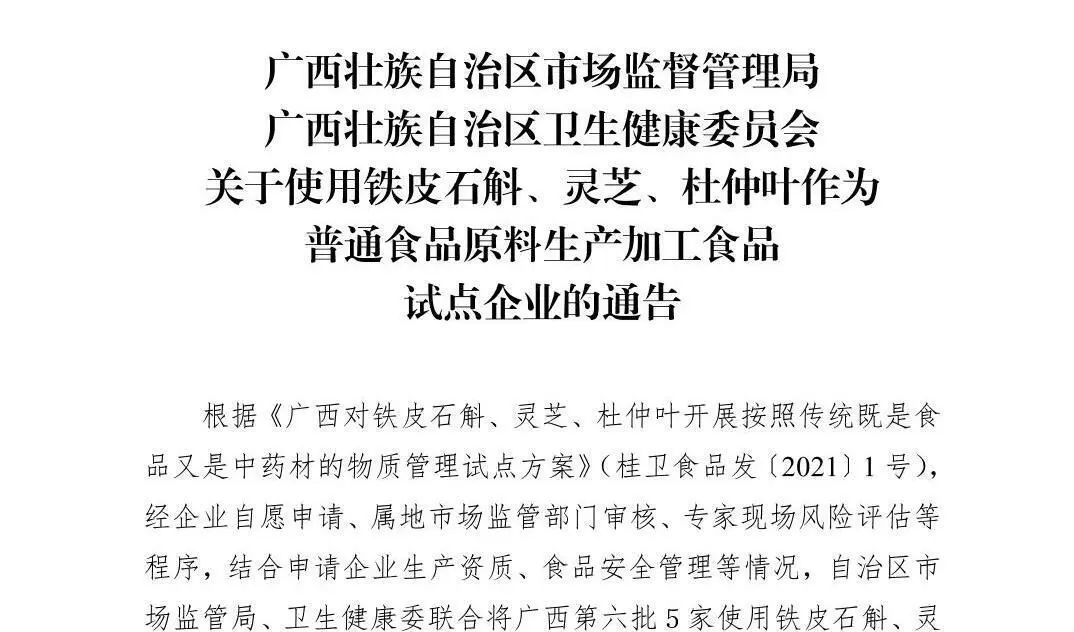 关于使用铁皮石斛、灵芝、杜仲叶作为普通食品原料生产加工食品试点企业(第六批)的通告
