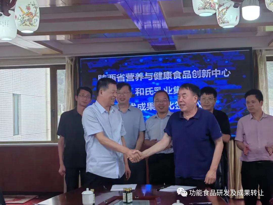 会上,陕西省营养与健康食品创新中心、陕西省功能食品工程技术研究中心刘建书主任与和氏乳业集团刘安让董事长对双方后期合作方向、大健康产品开发、成果转化及特医食品研究开发等方面进行深入探讨,并就丹参荷叶降血脂胶囊、五加参麻改善睡眠胶囊、五味子人参降血糖胶囊三项成果达成合作协议。