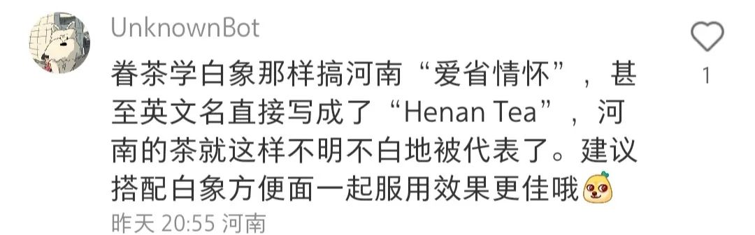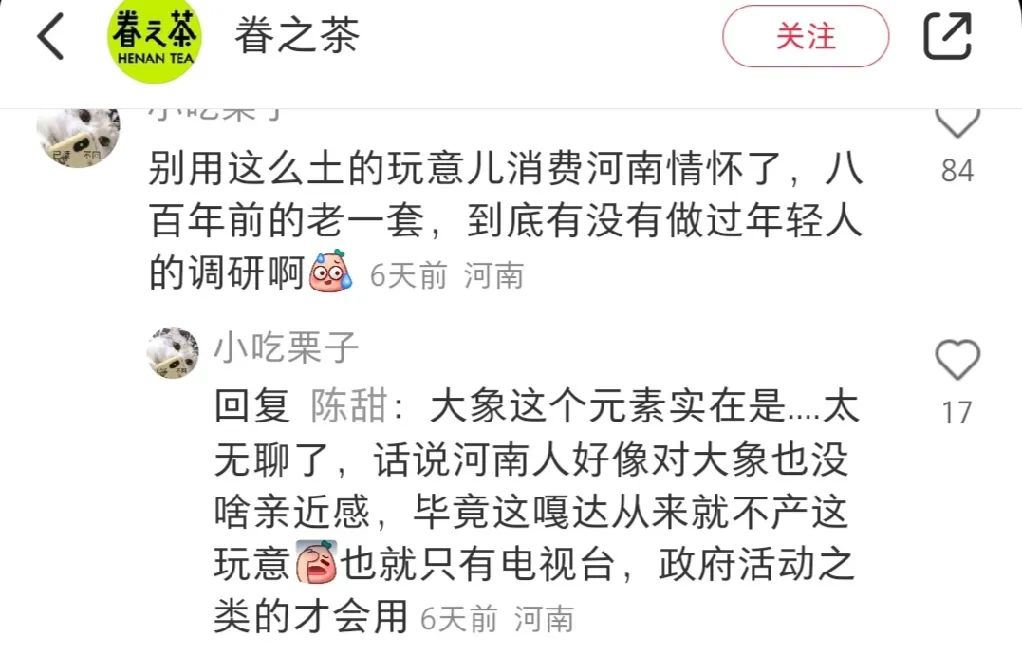 至于用大象形象来表达河南,或者用“中”字来表达河南,这种简单粗暴的标签化问题,以及部分网友对眷茶代表河南队出征的henan tea的不满意,可能更多的和大众对河南文化的理解有关,这种误解已经很久远了,尤其河南和大象的关系,以后可以专门探讨。敬请关注。