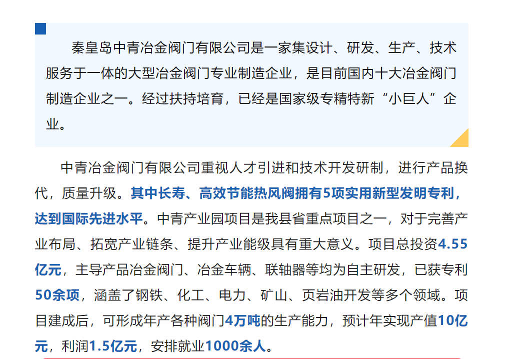 日前,秦皇岛中青冶金阀门有限公司中青产业园项目主体结构基本完成,已进入最后冲刺阶段即将投入运营,将为我县高质量发展提供有力支撑。