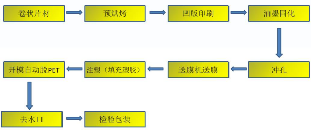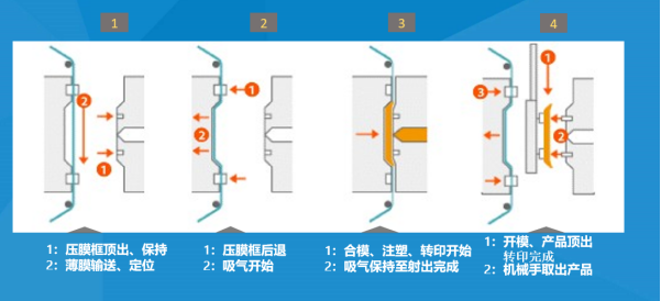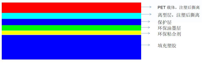 模内转印(In Molding Roller): 以卷状PET为载体,依次在其表面涂覆上离型层、保护层、图文层、粘合层、形成一种转移膜,通过送膜机将转移膜送入注塑机的模具型腔内,在注塑机的热熔塑料材料的成型过程中将粘合层融化,使塑胶、图文层、保护层形成整体脱离开PET载体膜,塑料制品表面获得了图文装饰和保护,达到装饰作用。