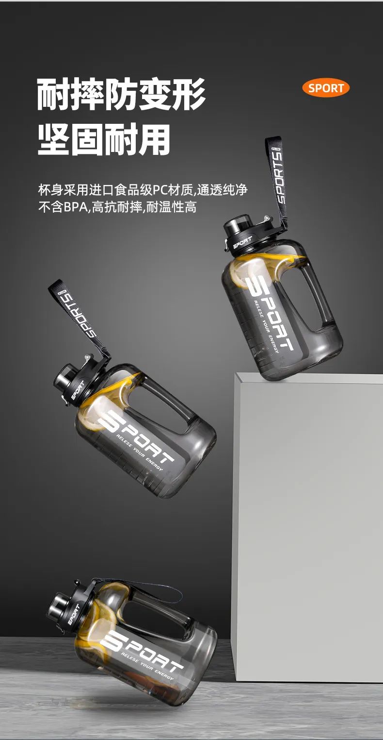 壶身采用PC食品级材质,超大容量,不管是室内健身,还是户外运动,1壶就能够补充人体所需的水分。