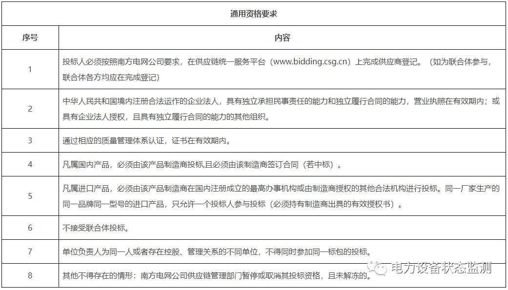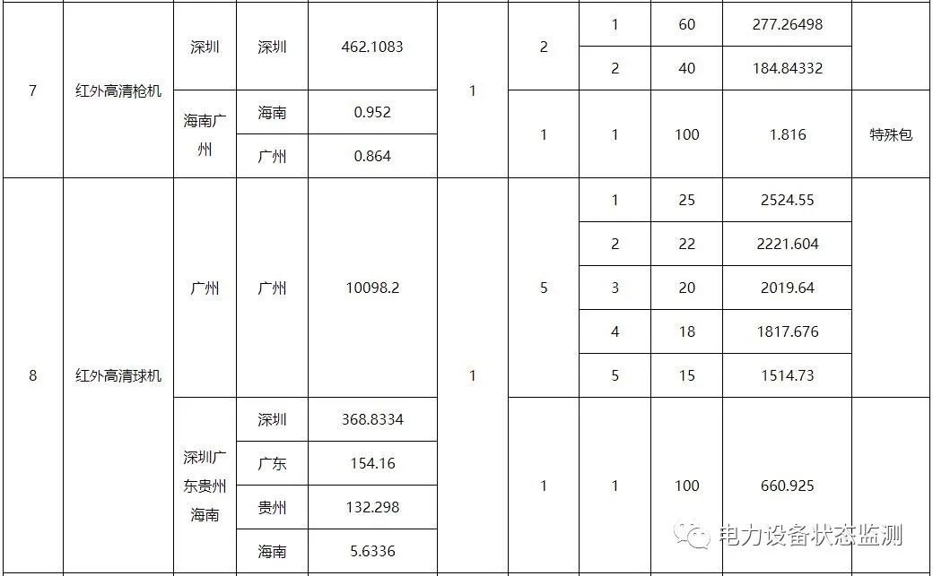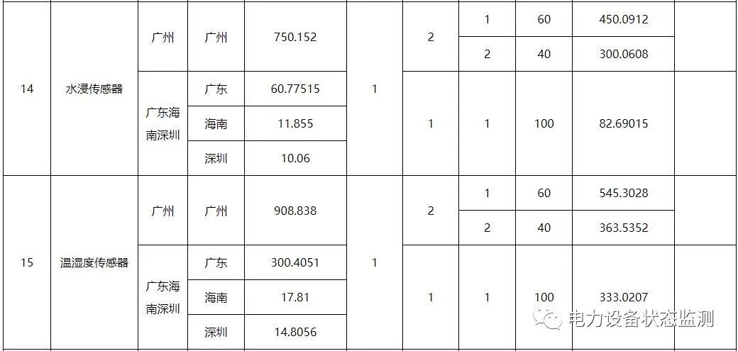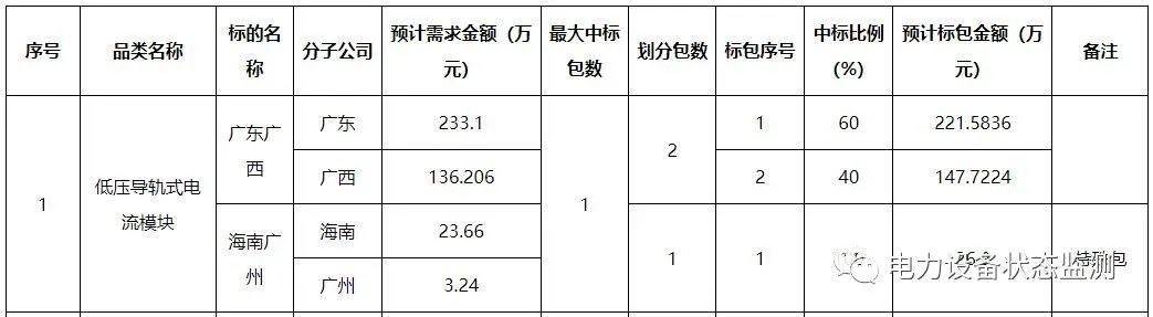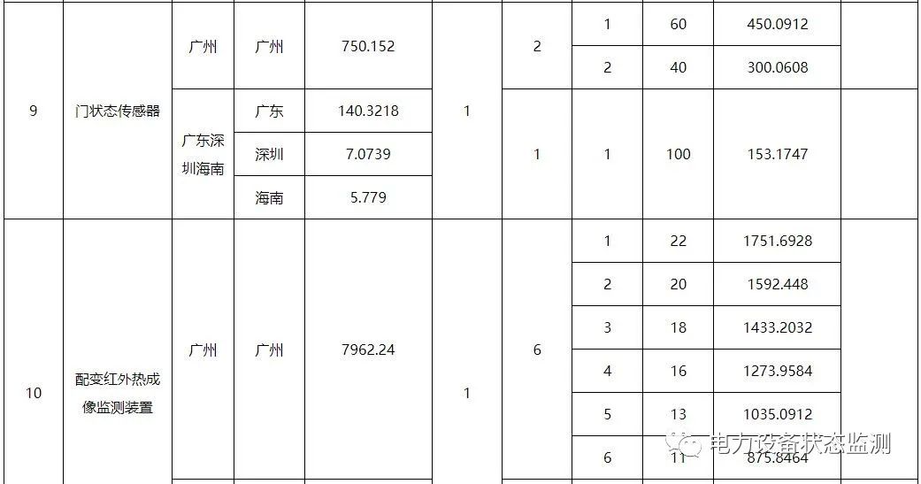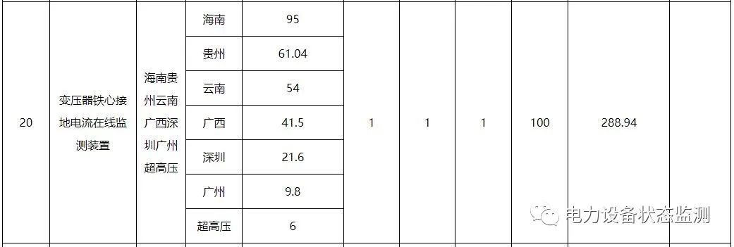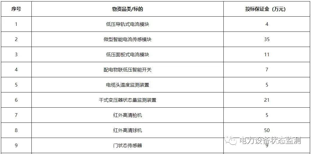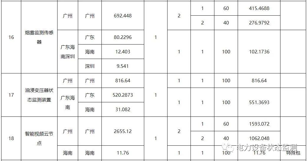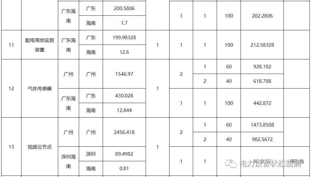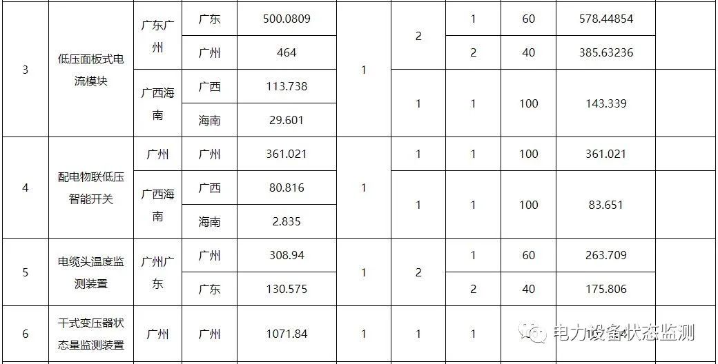 本批次框架招标范围包括数字变电站系列传感以及智能配电系列传感终端共21类物资,分别为:低压导轨式电流模块、微型智能电流传感模块、低压面板式电流模块、配电物联低压智能开关、电缆头温度监测装置、干式变压器状态量监测装置、红外高清枪机、红外高清球机、门状态传感器、配变红外热成像监测装置、配电局放监测装置、气体传感器、视频云节点、水浸传感器、温湿度传感器、烟露监测传感器、油浸变压器状态监测装置、智能视频云节点、10kV台架变综合配电箱、变压器铁心接地电流在线监测装置、色谱型变压器油中溶解气体在线监测装置。需求单位为广东、广西、云南、贵州、海南电网公司,超高压公司和深圳供电局。