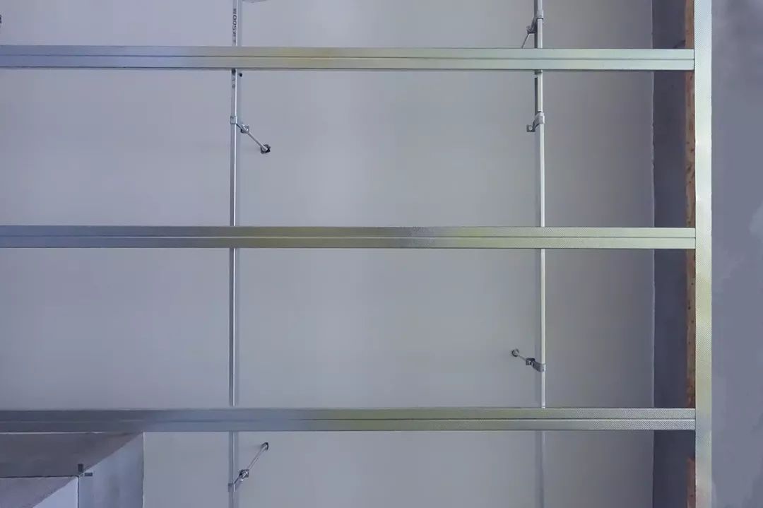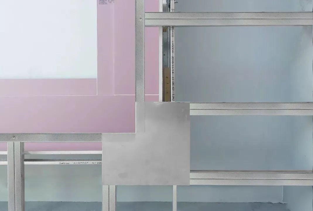 ▲ 1、法国圣戈班轻钢龙骨隔断制作工艺骨架采用75竖向龙骨,天、地龙骨及横穿、竖向间距40cm,采用拉铆枪连接,天、地龙骨采用金属膨胀栓固定连接;