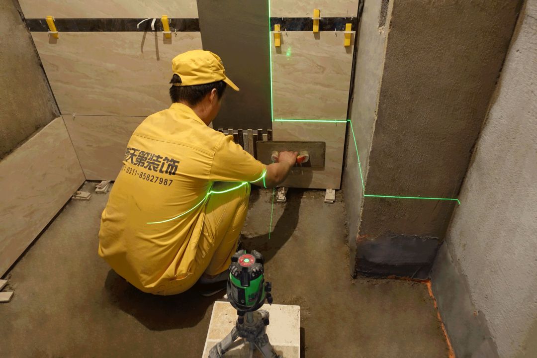 4、预排砖程序,A、工人铺贴根据图纸设计要求先在墙体放施工铺贴大样线,根据线的精确尺寸进行预排砖,确保最终的完美效果。B、地砖预铺3-5平米,干铺不打灰浆,然后由工长或质检人员检查砖自身的平整度及缝是否均等,如发现尺差立即停止施工,这样不会给业主造成损失。