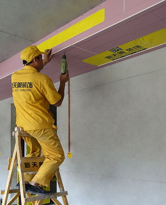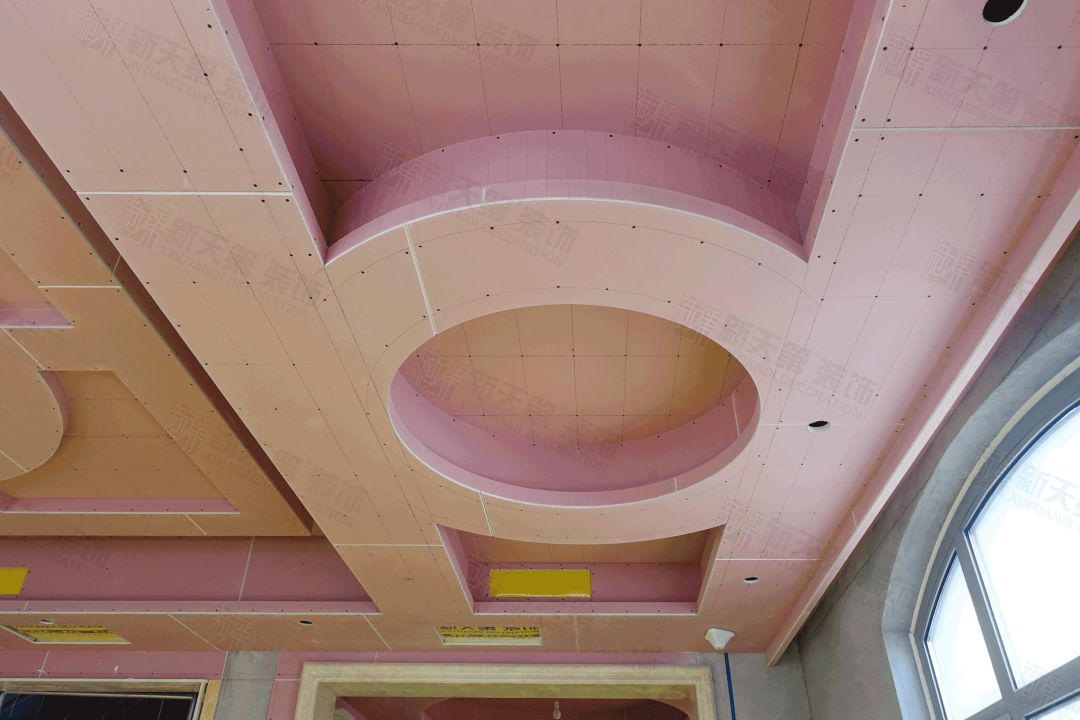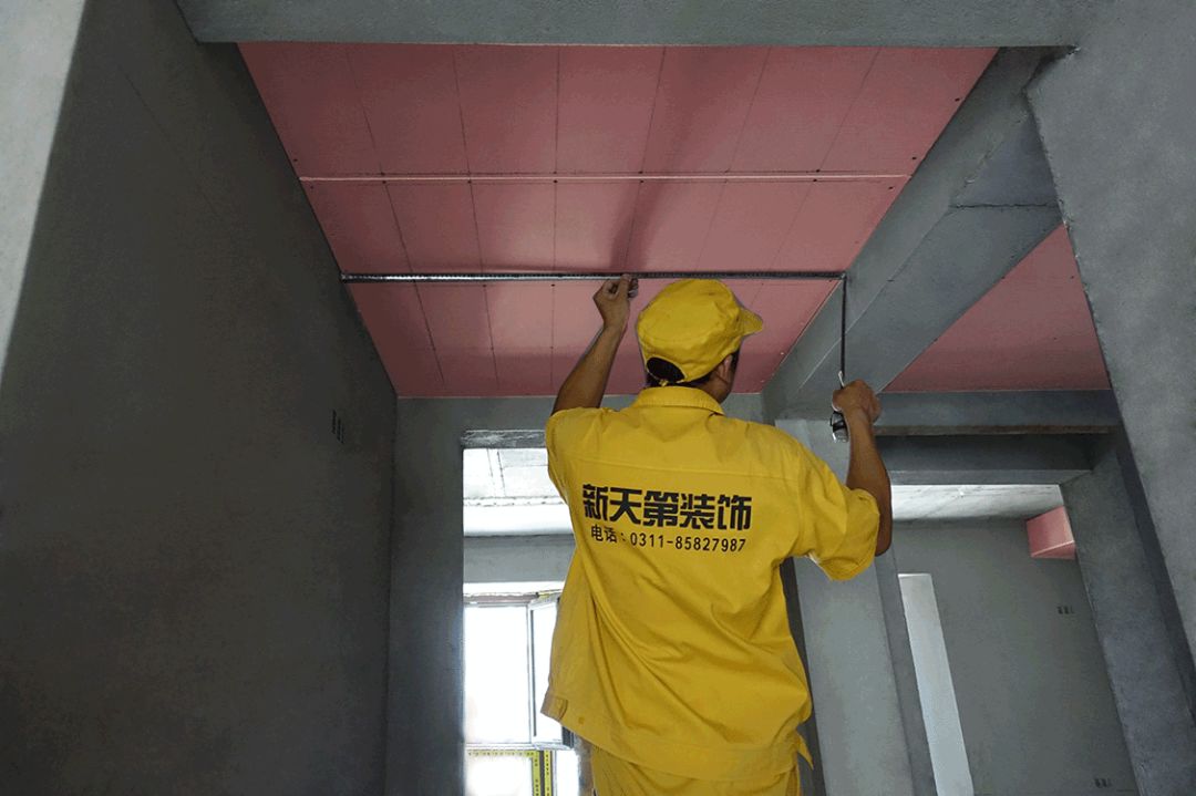 1、新天第装饰采用耐火石膏板吊顶工艺,裁板断料有着自己独到的规范标准;