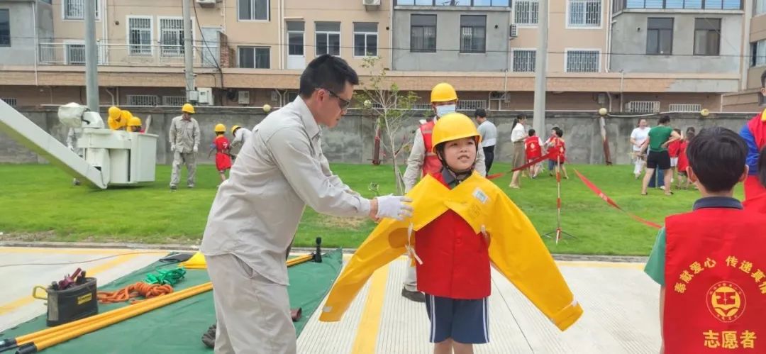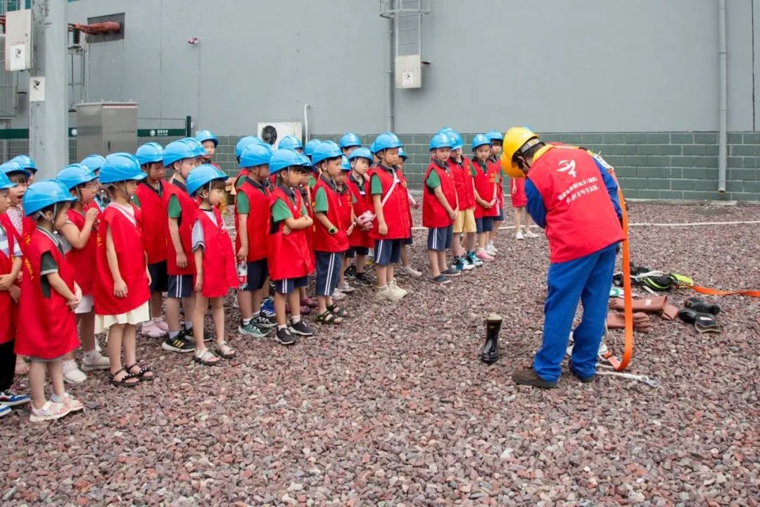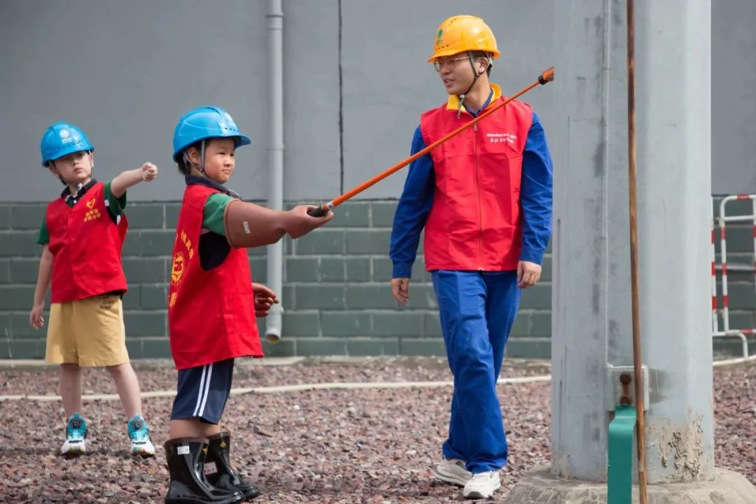 在介绍了变压器的作用之后,工作人员还演示了一些电力工人常用的工器具,并指导同学们正确佩戴安全帽、使用绝缘手套、高电压验电棒。一番讲解下来,同学们对电的安全使用也有了概念。