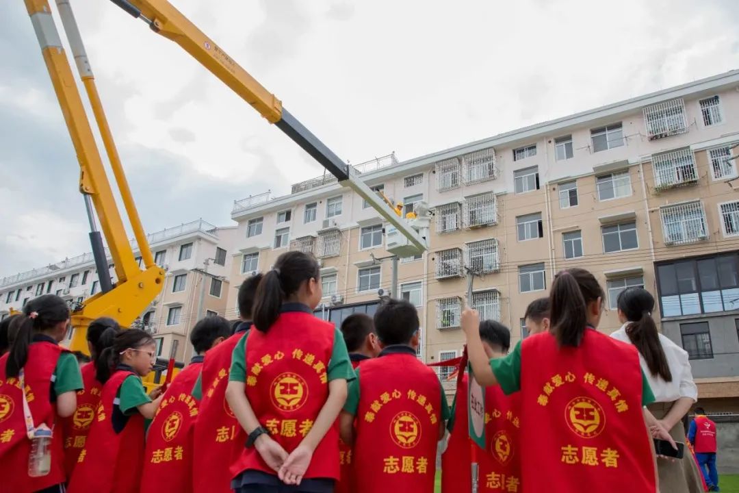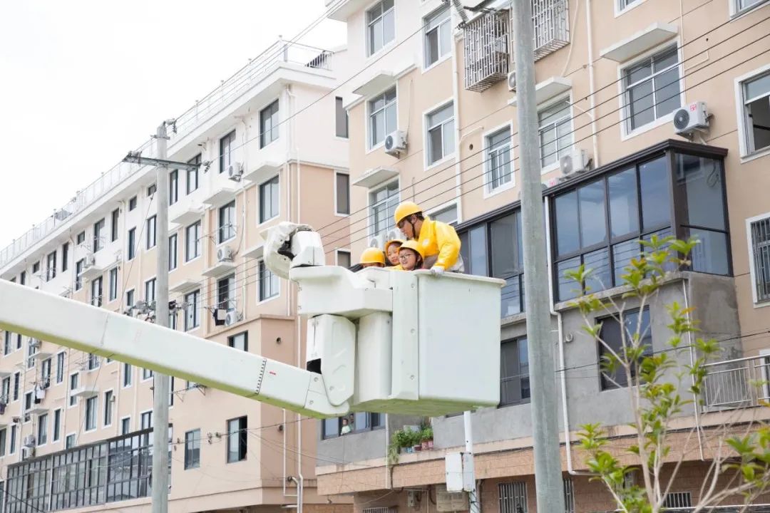 穿上带电作业服、绝缘鞋,戴上安全帽,短短的几分钟穿戴过程,每位学生的脸上都留下了豆大的汗水。随着带电作业车斗臂缓缓上升到距离地面10多米的高处,学生们还近距离观看电力工人完成模拟作业。