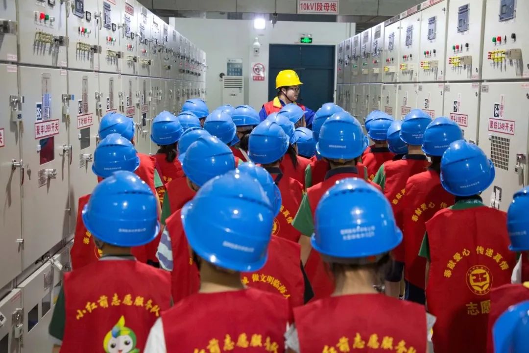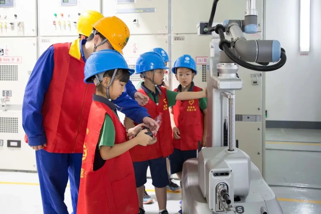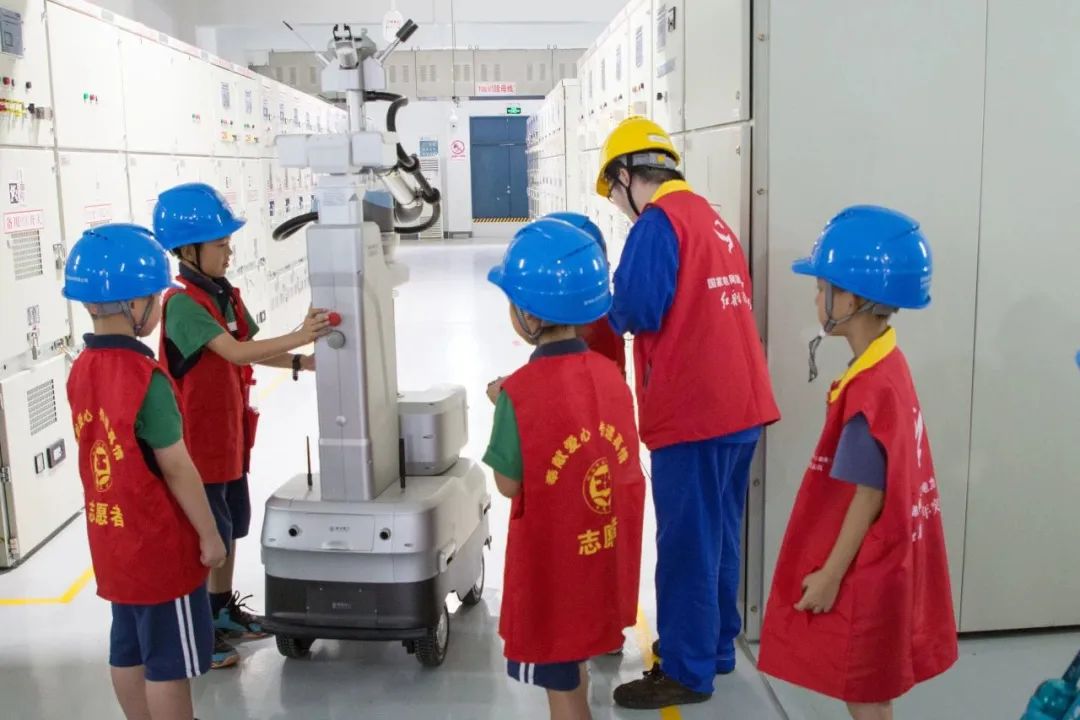 在变电站的开关室里,同学们参观了各种设备,被智能操作机器人深深吸引。在工作人员的指导下,同学们操作它前往指定设备,完成了设备状态核对的任务。
