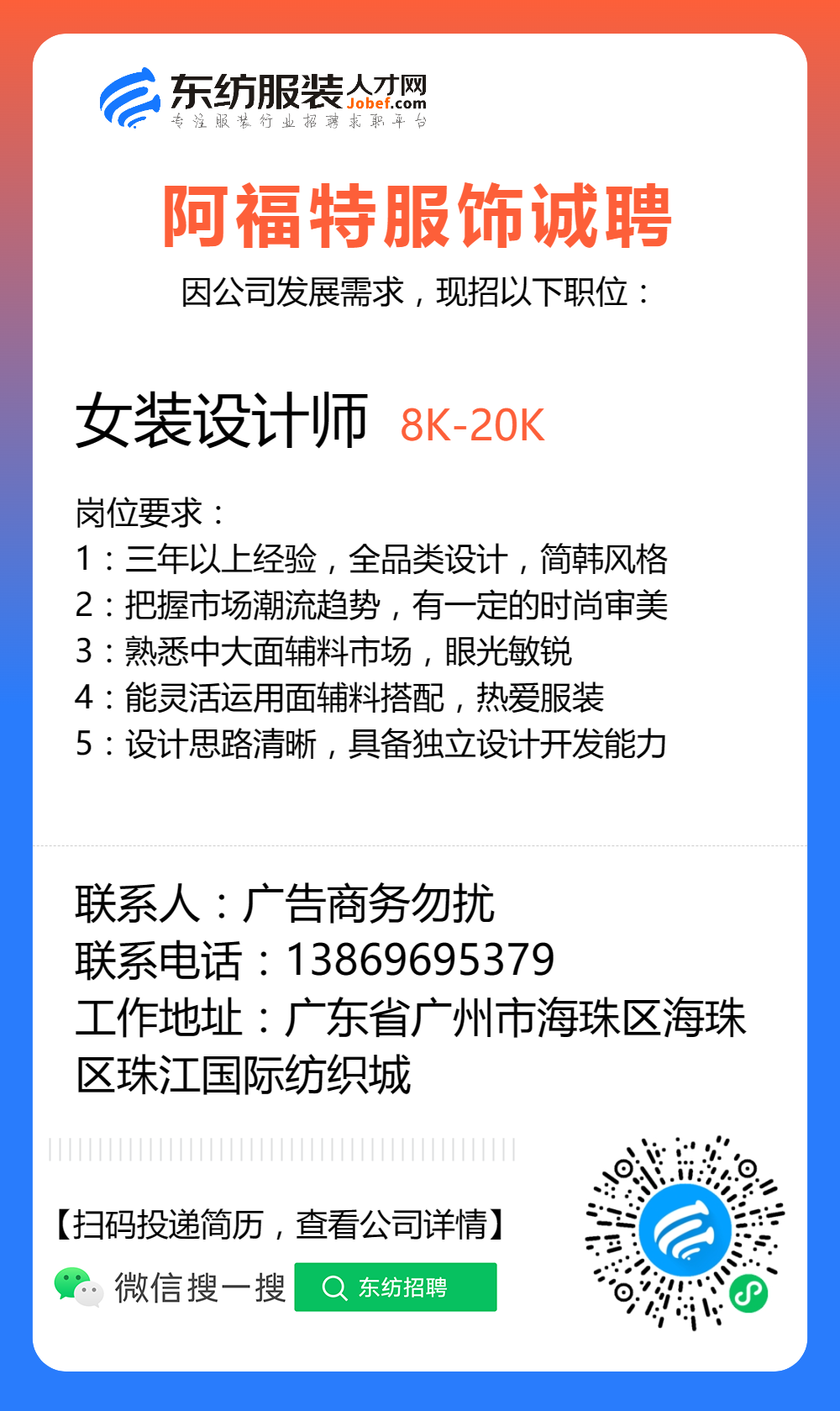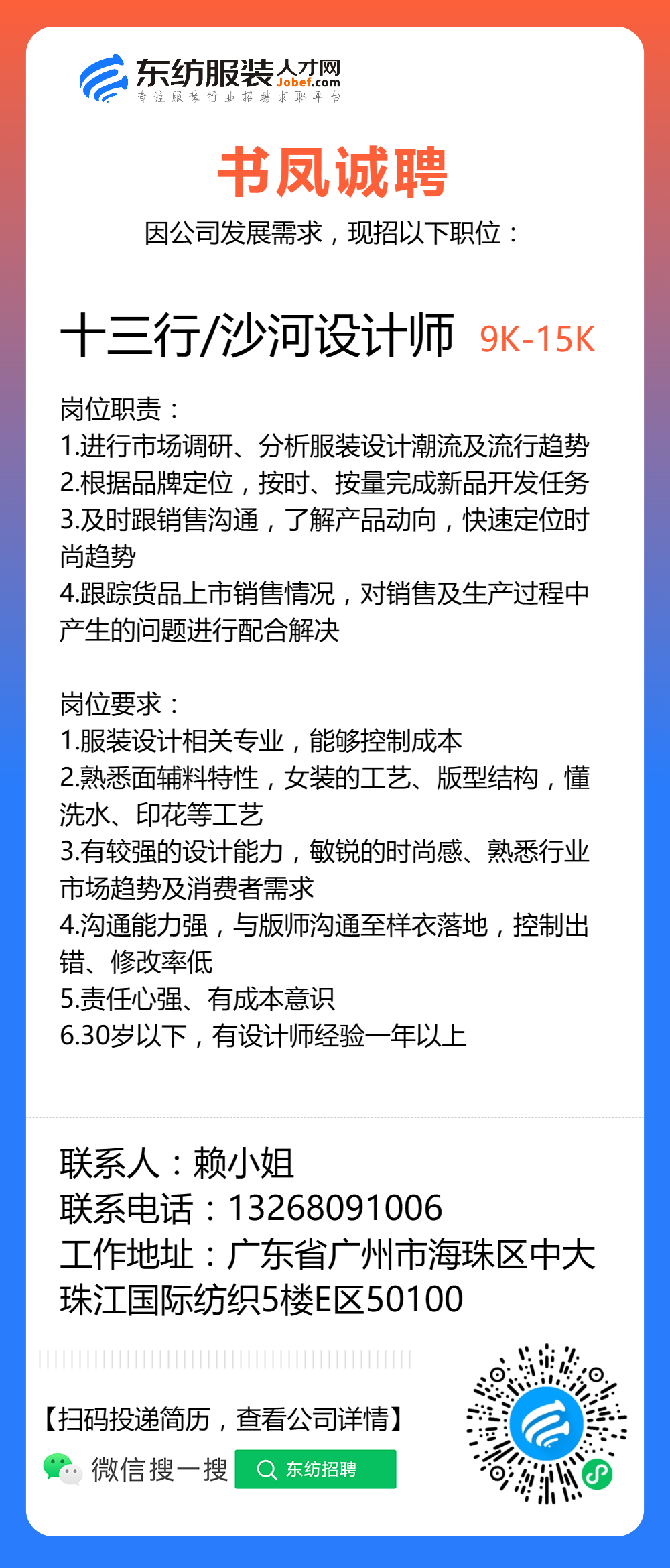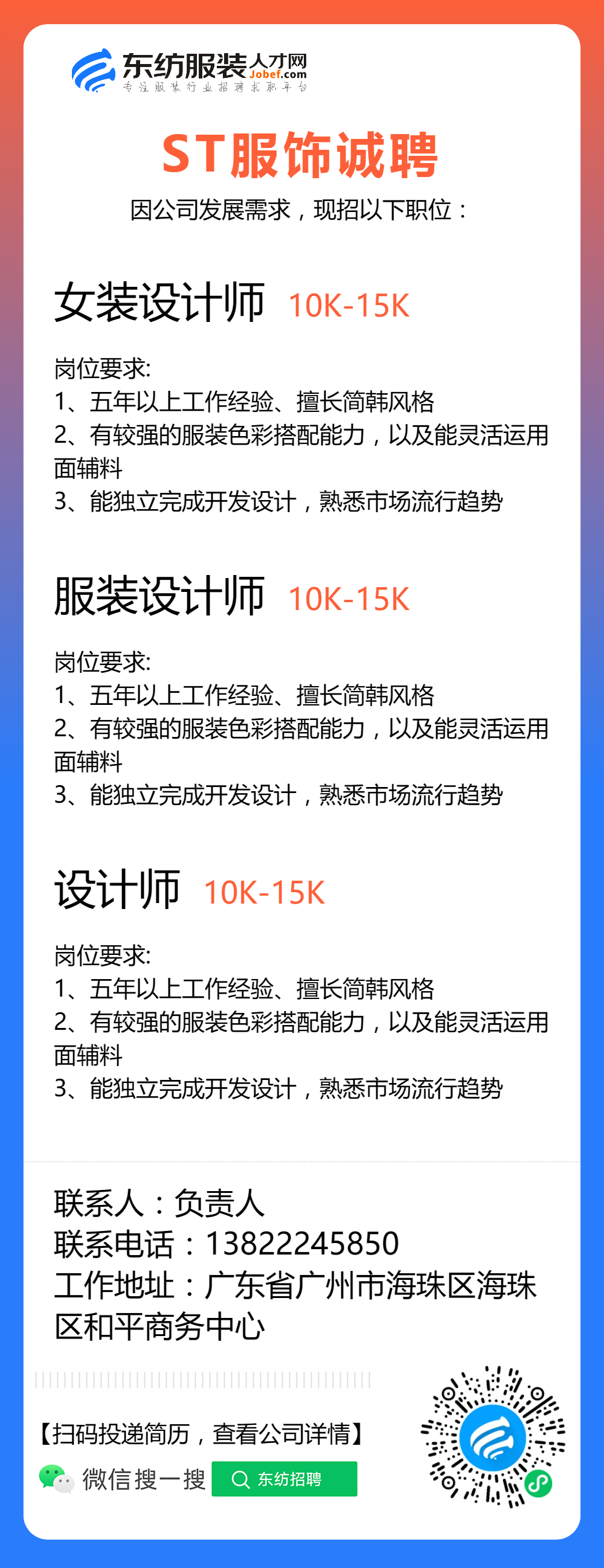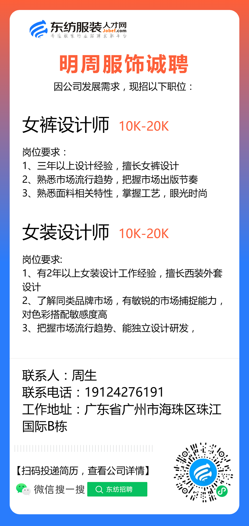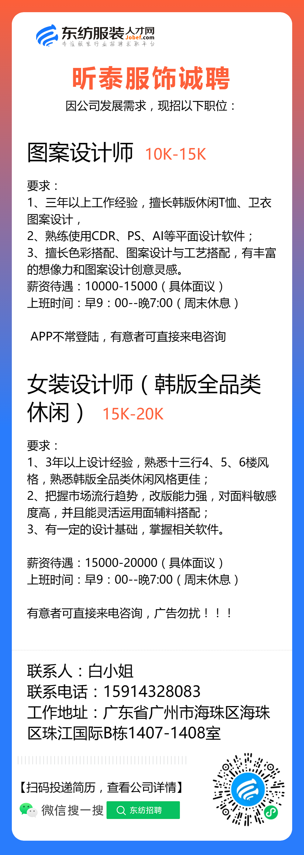 服装招聘·设计类丨8. 19 号,女装设计师、男装设计师、童装设计师、设计助理.....