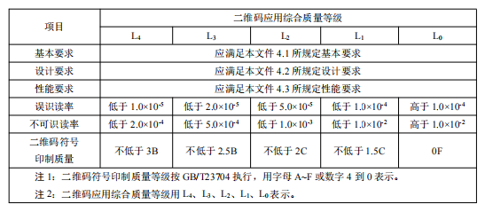 根据二维码扫描识读的误识读率、不可识读率和二维码符号印制质量等级,给定二维码应用综合质量等级。用 L4、L3、L2、L1、L0表示不同的质量等级,其中 L4 代表最高等级,L0 表示最低等级。