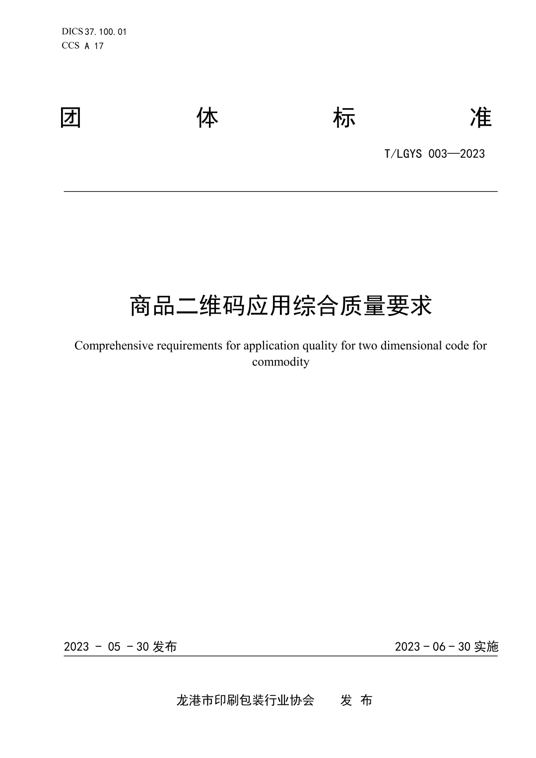 《商品二维码应用综合质量要求》(T/LGYS 003-2023)由龙港市印刷包装行业协会提出制定,温州豪格防伪科技有限公司为主要起草单位,浙江巨福包装有限公司和温州市起印包装有限公司等8家为参与起草单位,已于2023年6月30日起实施。该标准可作为商品二维码制作和使用的过程控制和质量评价的基础。