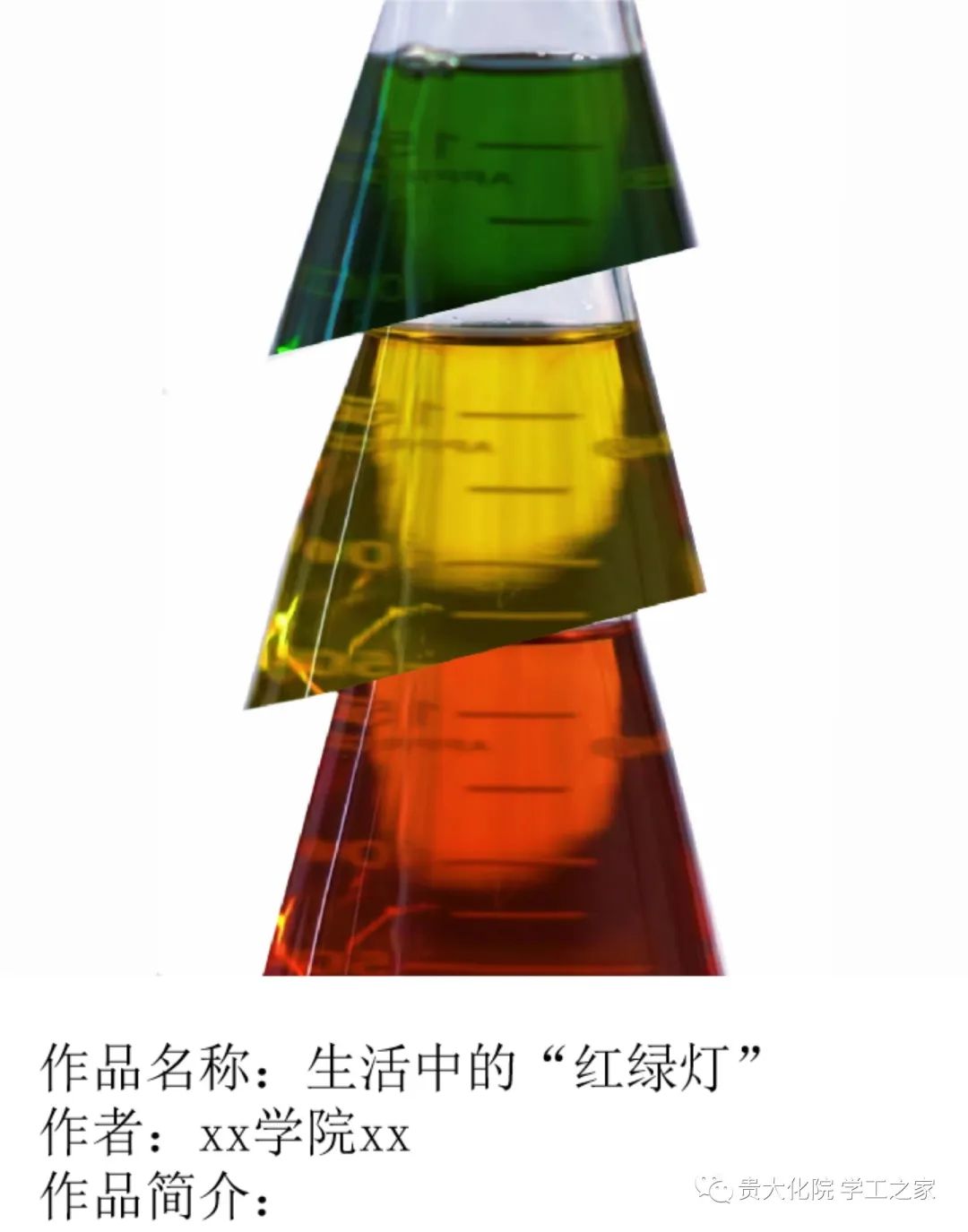 图片内容与实验室中的化学或生活中的化学相关,图片下方附作品名称、作者姓名及学院、作品简介。