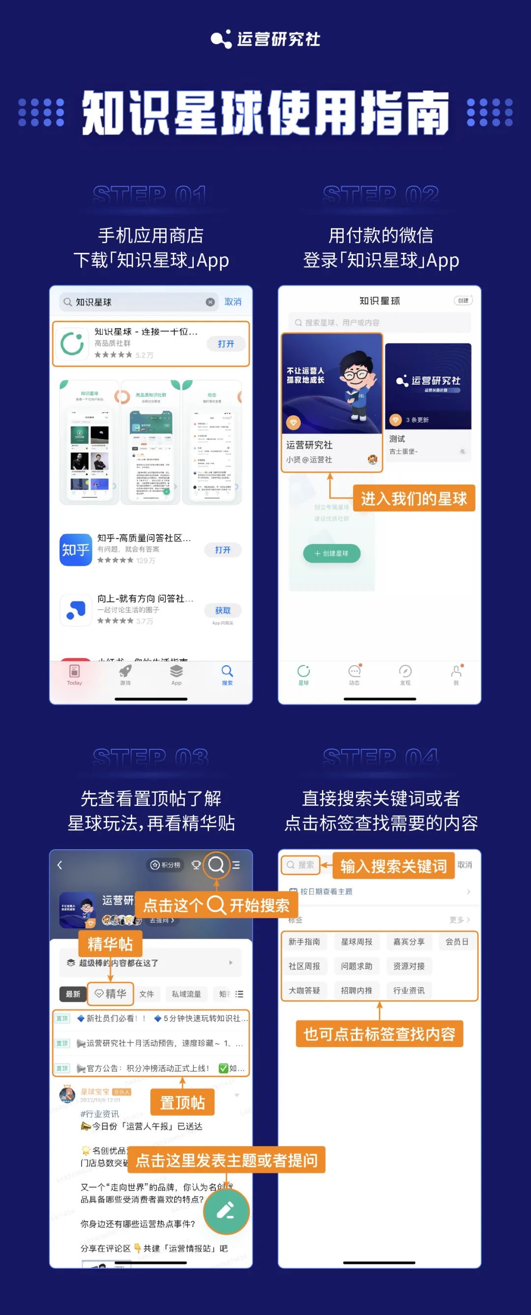 扫码付款后请去应用商店下载「知识星球」App,用付款的微信登陆App即可进入「运营研究社」知识星球,及时获取星球里分享的最新干货啦~