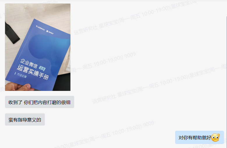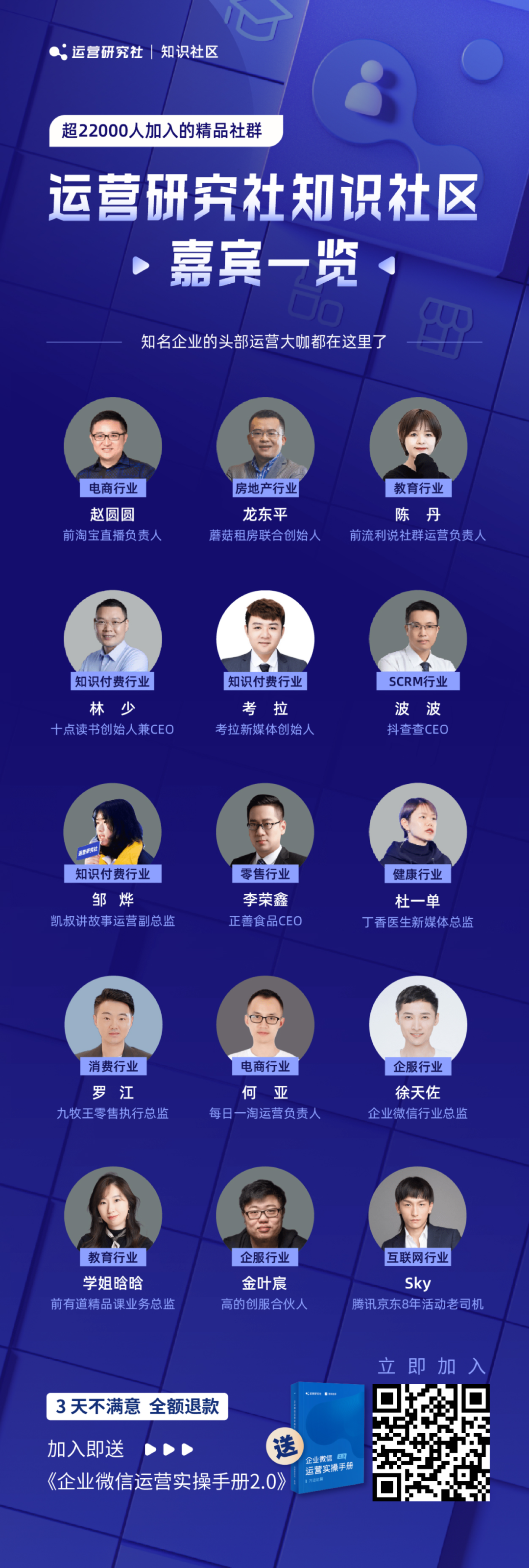 现在加入运营研究社知识社区即可领取《企业微信运营实操手册2.0 》纸质版一份。加入后,即便你觉得不合适,也可以在 3 天内无条件全额退款。