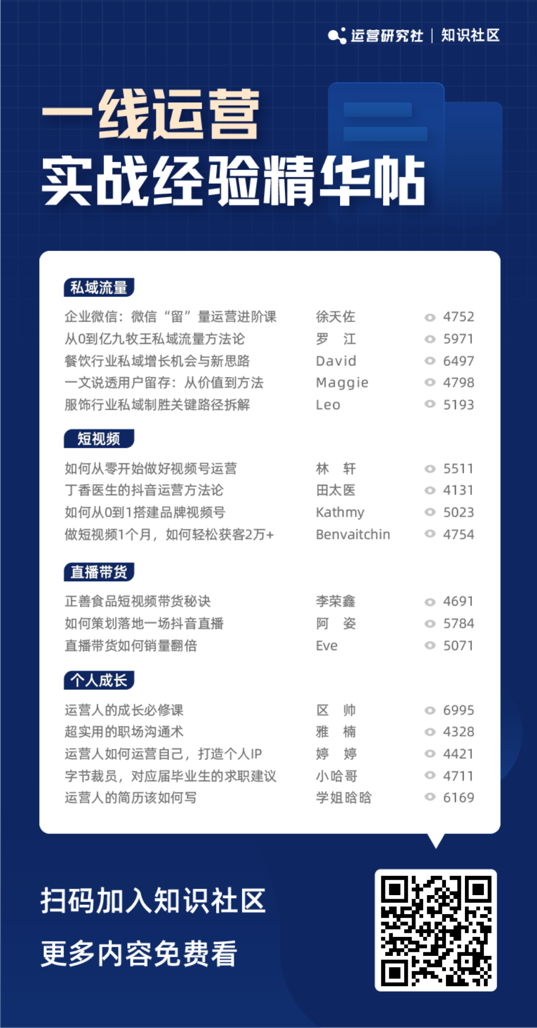 所以,欢迎你加入我们,和志同道合的运营人抱团成长,我们社区里见!