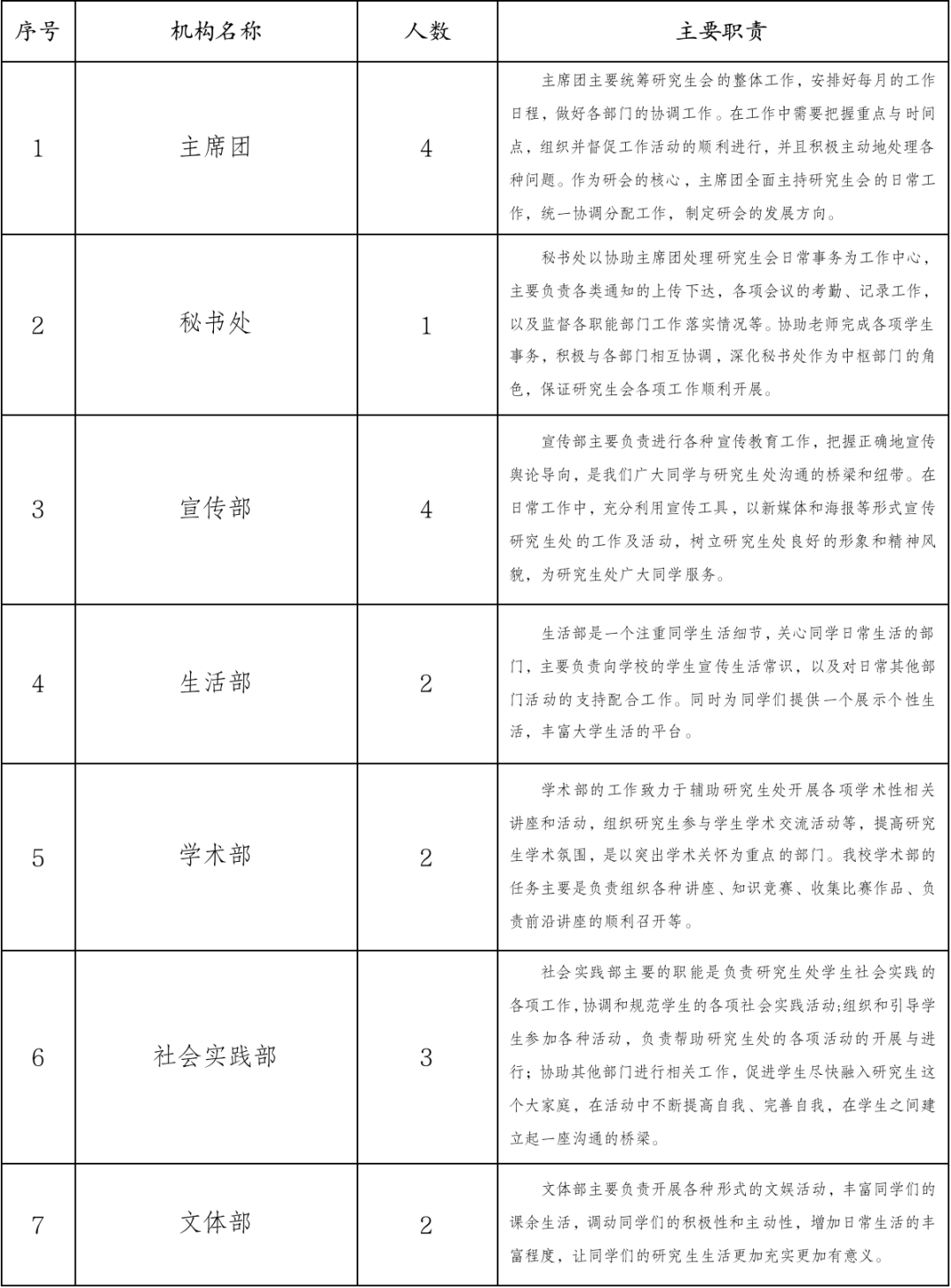 第十八条 研究生会工作部门一般不超过6个,各部门设负责人1至4人,工作人员不超过40人。