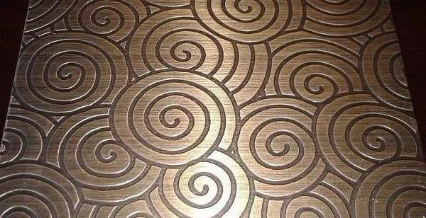 3、蚀刻系列,可蚀刻图形可见图片。蚀刻后可渡颜色或度色后进行蚀刻)彩色不锈钢蚀刻板是在物件表面通过化学的方法,腐蚀出各种花纹图案。以8K镜面板或者拉丝板为底板,进行蚀刻处理后,对物体表面再进行深加工,可进行局部的和纹,拉丝,嵌金,局部钛金等各式复杂工艺处理,实现图案明暗相间,色彩绚丽的效果。蚀刻不锈钢包括彩色不锈钢蚀刻,图案多种,可供广大选用的颜色有:钛黑(黑钛)、天蓝、钛金、宝石蓝、咖啡色、茶色、紫色、古铜、青古铜,香槟金,玫瑰金、紫红、钛白、翠绿、绿色等,适用于:星级酒店,KTV,大型商场,高级娱乐场所等。也可以根据客户的图纸和要求定做,但是需要出模板费用。