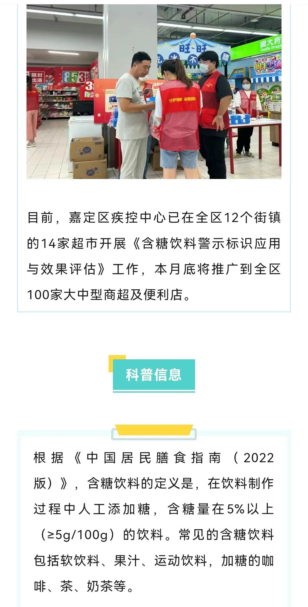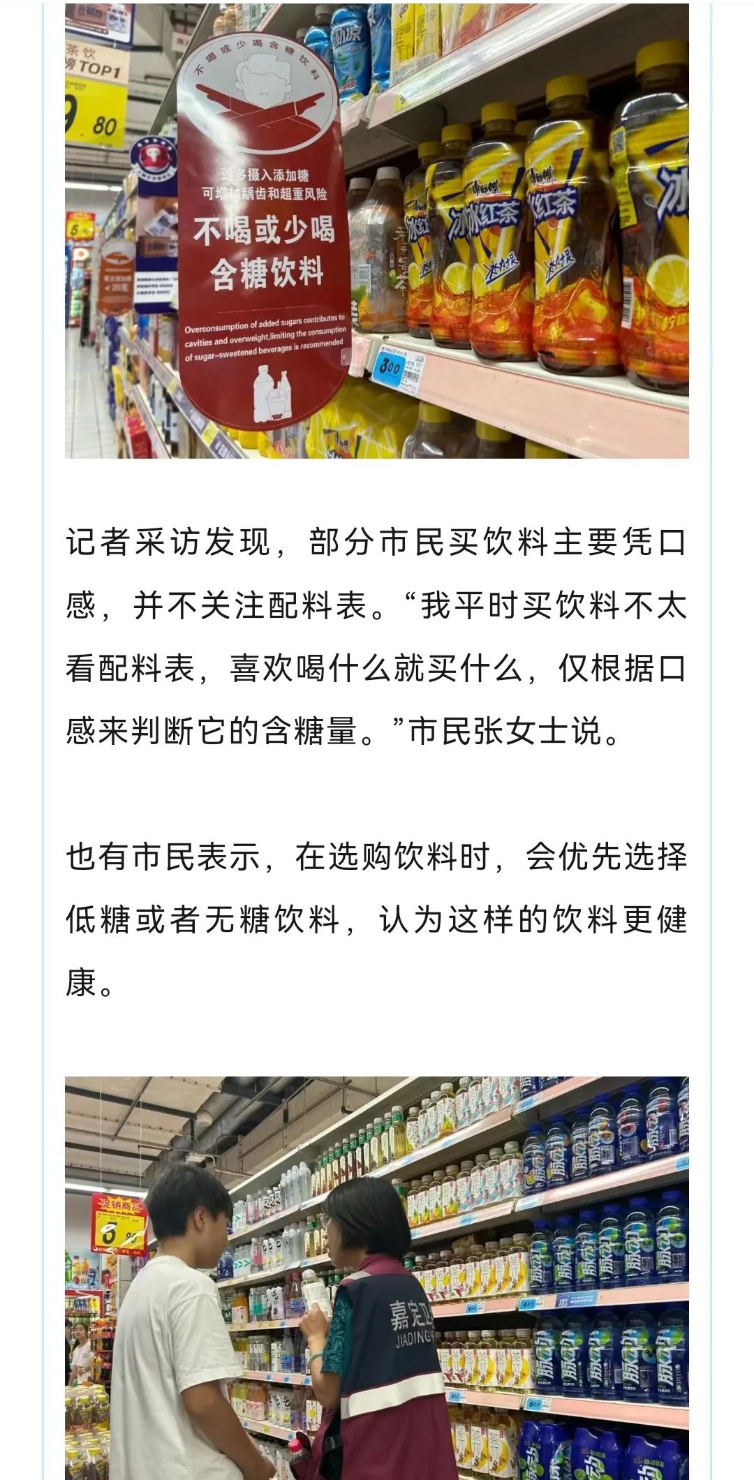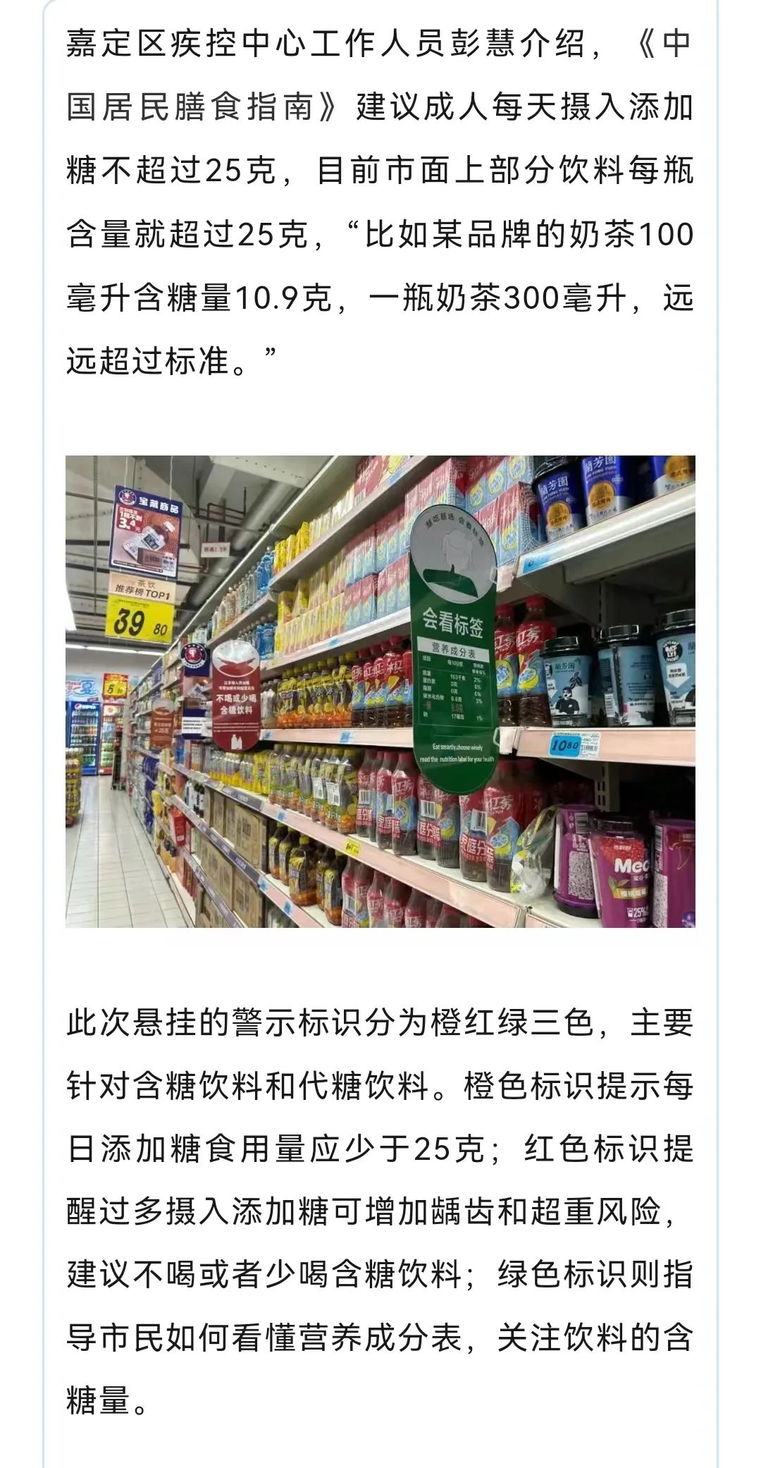 含糖饮料过多摄入危害大,为了提升市民健康意识,上海市疾控中心制定了《含糖饮料健康提示标识试点应用及效果评估实施方案》,在全市159家试点商超及便利店开展含糖饮料调查项目。这几天,嘉定试点商超里就挂起“红橙绿”标识,提醒消费者适当购买含糖饮料!