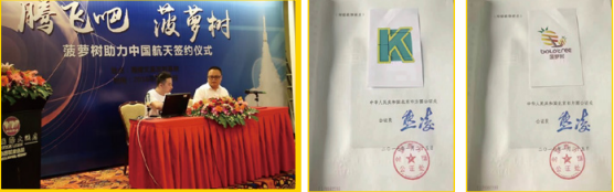 2016年10月17日神州十一号飞船搭载菠萝树品牌及菠萝字母K,陪同航天员共同飞向太空,并于11月18日安全返回地球。