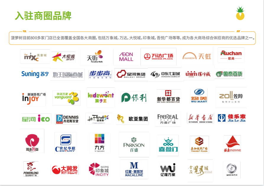 菠萝树目前800多家门店已全面覆盖全国各大商圈,包括万象城,万达,大悦城,印象城,吾悦广场等等,成为各大商场综合体招商的优选品牌之一。