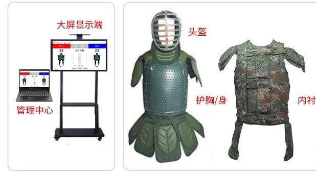 1、感应护身套件:护身一体化设计,在肩、胸、腿等部位安装感应器,后腰部位安装核心板采集数据并无线传送至刺杀训练与考评软件。
