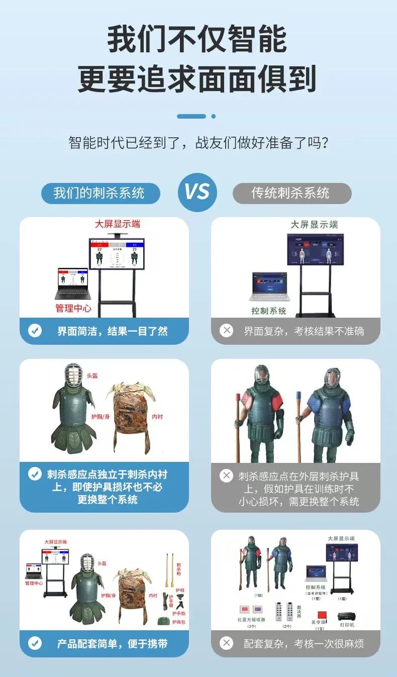 系统实时显示红蓝双方刺中对方得分;比赛时间可自由设定;根据双方得分评判胜负;系统具有4个模拟假人图像,刺中位置能够播放声效提示;可以使用军保卡的方式添加比赛名单,比赛成绩能够保存、查询。