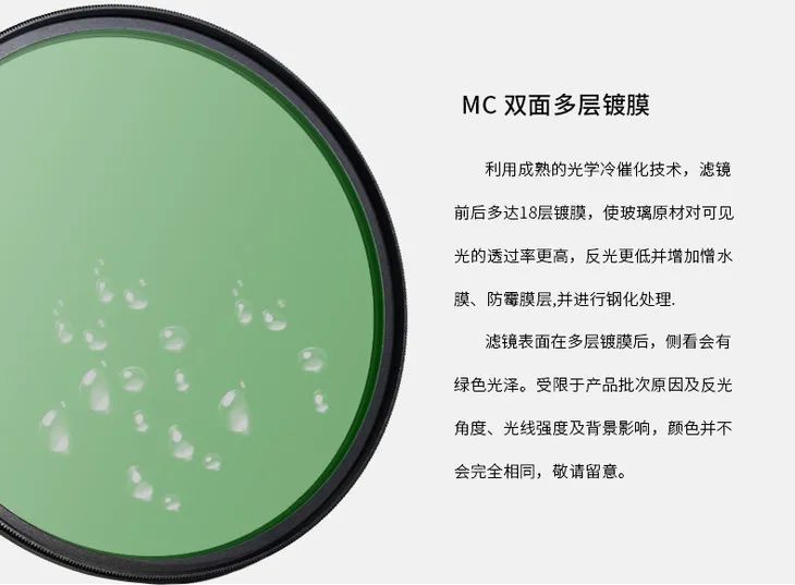 以卡色为例,上图左边的的UV(II),主要是性价比,材质一般,做工一般。右边的MCUV(II),则是超薄多层的UV,要比普通二代贵一些,好处是什么?画质影响较小,材质较好,做工精细。前后两者都是保护镜前镜片的作用。建议:中长焦考虑普通二代,如果是广角,建议考虑超薄多层,对UV的要求较高。