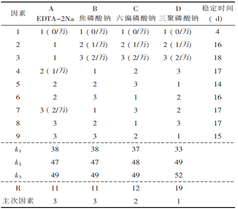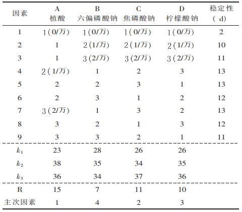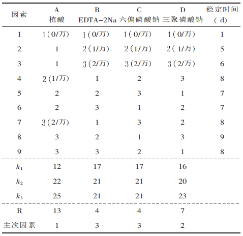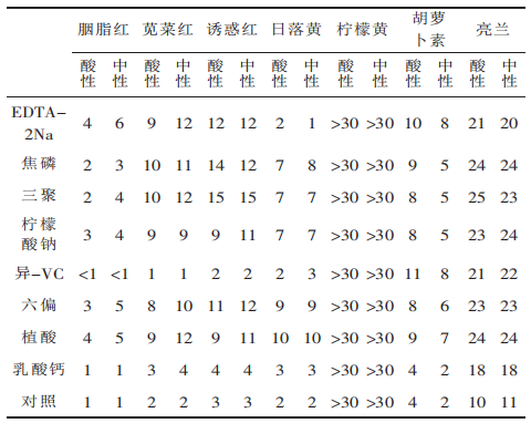 柠檬酸钠、三聚磷酸钠、焦磷酸钠、六偏磷酸钠、EDTA-2Na、植酸、异抗坏血酸钠、乳酸钙等护色添加剂对胭脂红、苋菜红、诱惑红、柠檬黄、日落黄、亮蓝、β-胡萝卜素等色素的护色试验,结果见表1。从表1中可见,护色剂植酸、磷酸盐类、柠檬酸钠对各种色素均有较明显的护色作用。这可能是由于这些物质具有络合金属离子的作用,从而减少金属离子对色素稳定性的负面影响;乳酸钙对各种色素的护色效果不明显,但也未见副作用;EDTA-2Na对大多数色素护色效果显著,但对日落黄却有负面作用,其原因尚不清楚;异抗坏血酸钠除了对β-胡萝卜素和亮蓝有一定的护色作用以外,对其它的色素均有负面作用。这可能是因为异抗坏血酸钠具有抗氧化作用,即还原作用,而这些色素受还原作用,易褪色。这与一般所谓的异抗坏血酸钠的护色作用,有一定的矛盾,希望引起注意。在单一护色添加剂护色试验的基础上,对胭脂红、苋菜红、诱惑红、日落黄、及β-胡萝卜素等稳定性较差的色素进行护色剂复配试验。选用各色素护色效果较好的4种护色添加剂,各取三个添加量(0/万、1/万、2/万),按正交设计,以色素稳定时间为指标进行优选试验。选择植酸、EDTA-2Na、六偏磷酸钠及三聚磷酸钠等4种护色剂,进行复配优选试验,结果见表2。