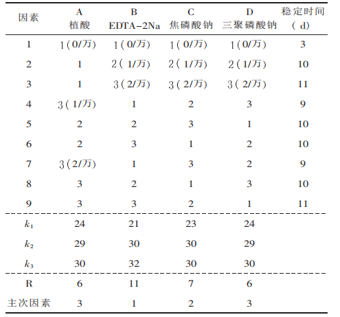 表2显示,胭脂红最好护色添加剂的组合为植酸2/万、三聚磷酸钠2/万、EDTA-2Na1/万、六偏磷酸钠1/万。以此组合的复配护色添加剂用于试验胭脂红色素的色泽稳定性,其色泽稳定性可达到10d。选择植酸、EDTA-2Na、焦磷酸钠及三聚磷酸钠等4种护色添加剂进行复配优选试验,结果见表3。