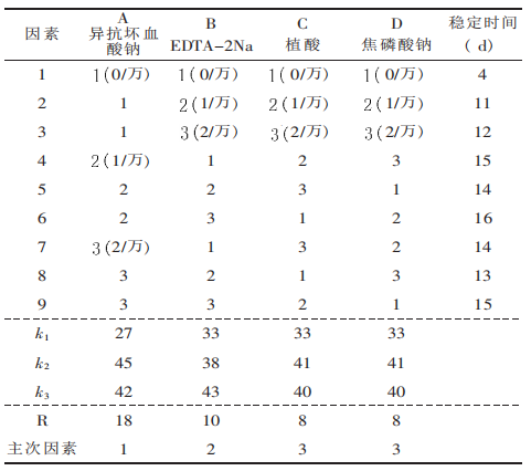 表6显示,β-胡萝卜素最好护色添加剂的组合为异抗坏血酸钠1/万、EDTA-2Na2/万、植酸1/万及焦磷酸钠1/万。以此组合的复配护色添加剂用于试验诱惑红色素的色泽稳定性,其色泽稳定性可达到17d。结论速读