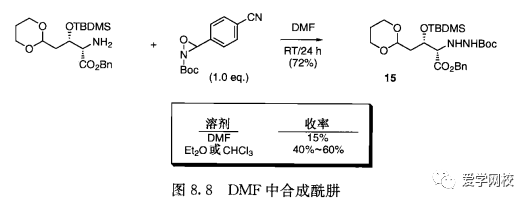 选择最合适的溶剂收率就会明显提高(第4章)。在合成酰肼15时,筛选了各种溶剂(图8. 8),使用极性较大的溶剂,收率会提高,可能原因就是该反应存在一个极性活性中间体。如果在平衡反应中某一组分能从反应体系中分