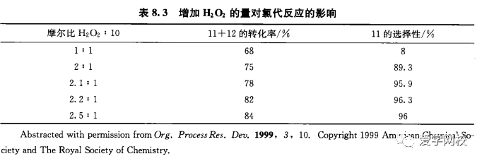 就如前面讨论的,减少反应底物的量可以减少投料时间、原材料消耗和废物排放。但是减少反应物的当量会导致反应时间的延长,因为最后的10% (或者更少)的起始原料转化为产品需要更长的时间。如表8.3所示的对甲苯磺酸的氯代反应。当H2O2:10的摩尔比从2.2 : 1提高到2.5 : 1时,转化率没有明显的提高,所以在规模化生产时就可能采用低当量的投料。
