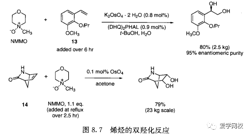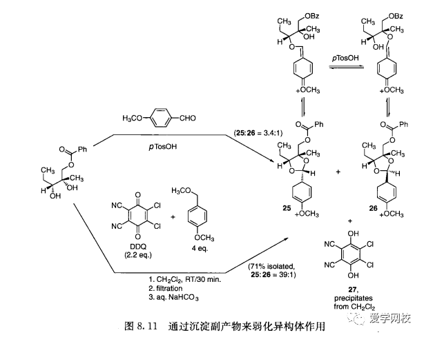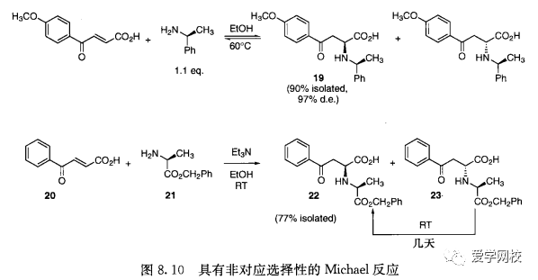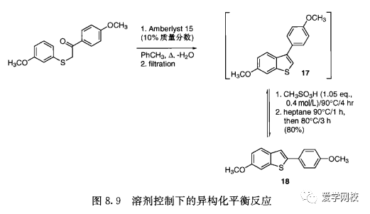 离出来,那么改变溶剂可对平衡反应进行优化。如图8.9 所示经过一系列反应以 80%的收率合成raloxifene 的中间体18,研究表明在热平衡状态下17 与18 的比值为10:90,在异化反应快完成时加正庚烷,中间体18 就会从反应体系中结晶出来,最终产品中17 与18 的比值为2:98图8.10 所示利用Michael反应以 90%的收率得到基酸类化合物 19在这个条件下,Michael 加成反应是可逆的,但是化合物 19 的非对映异构体在溶剂中是可溶的而19 是不溶的,这样就使反应能够不断进行。为了加速这两个非对应异构体的相互转化,作者多加了 0.1当量的手性胺。化合物 0 与 L-丙酸反应得到基酸 22,在这个反应中油状的 23 很不稳定,室温放置几天可以转化为 [22],或许加热可以更有效地使20和21 转化为22