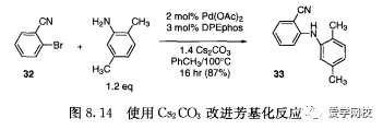 有时候在一组不同底物的类似反应中,反应结果会与预期结果不同。在这种情况下,一种明智的做法就是分析起始原料在结构上的差别,或许官能团影响了反应的转化方式。图8. 14中的例子:碳酸铯在化合物32进行芳基化反应中起关键作用[15]。叔丁醇钠在没有氰基取代的苯胺类化合物的反应中十分有效,但该反应使用叔丁醇钠只得到差不多30%收率,作者的解释是弱酸性的化合物33在强碱性的叔丁醇钠的存在下使催化剂失效了,但在碳酸铯不失效的条件下不会发生该情况。